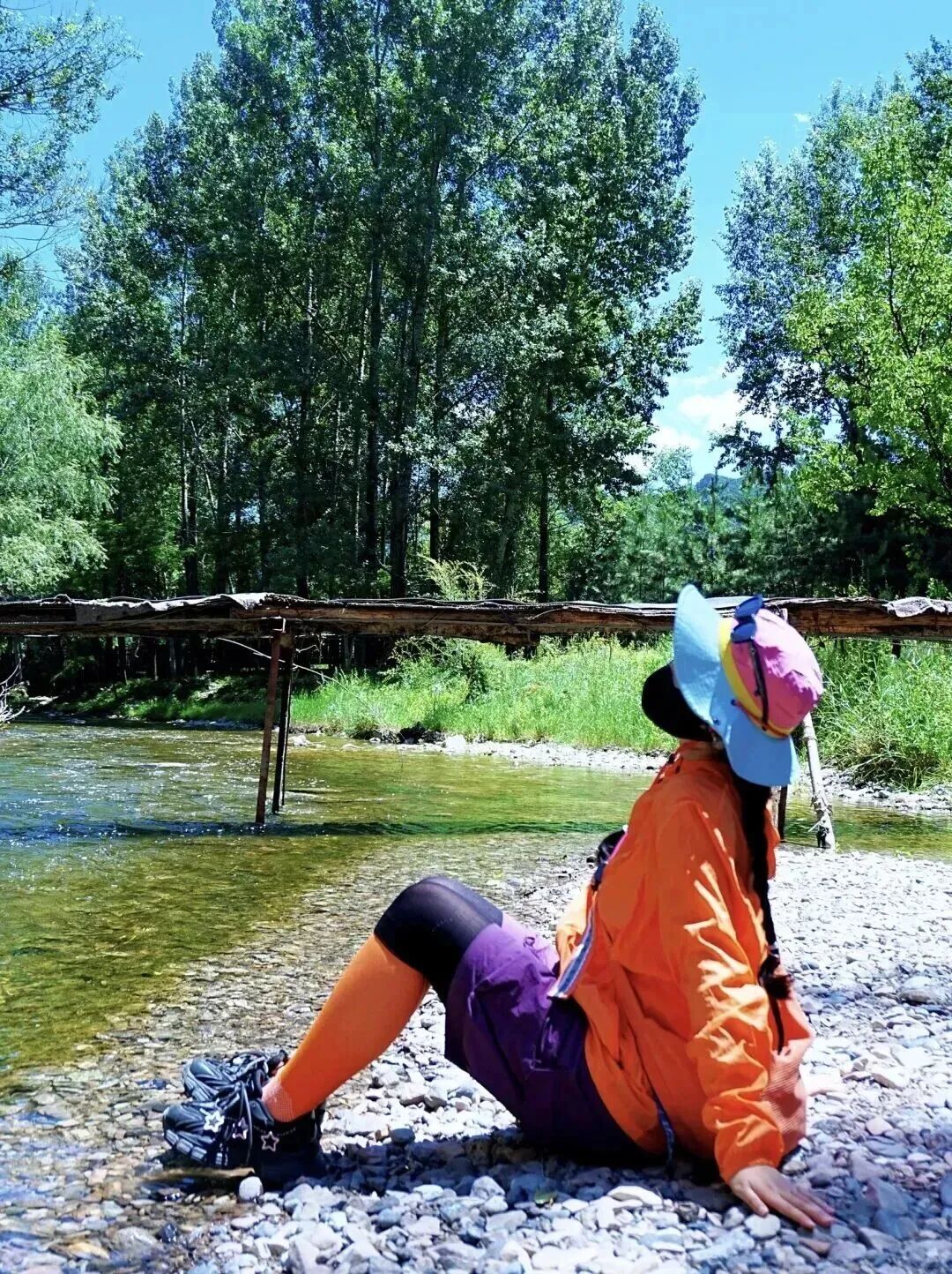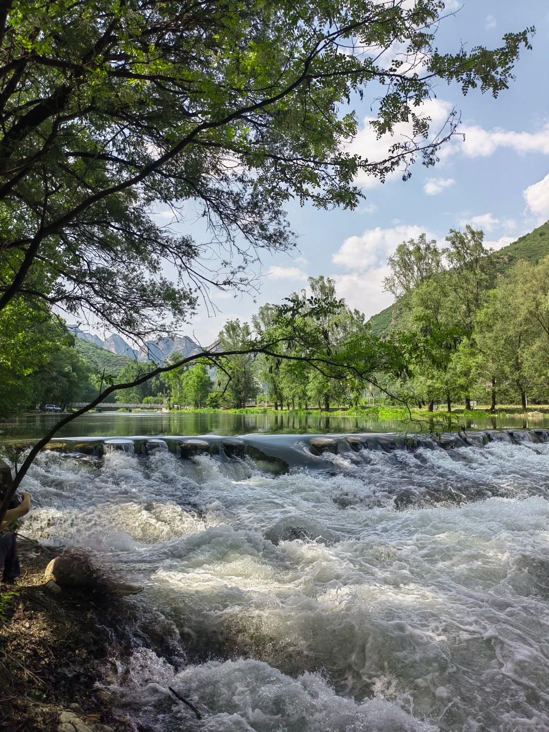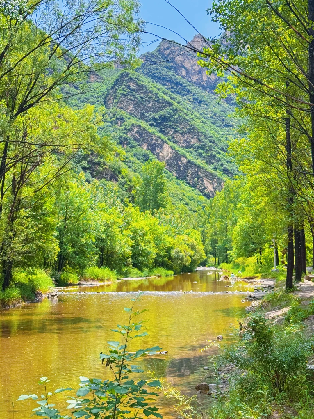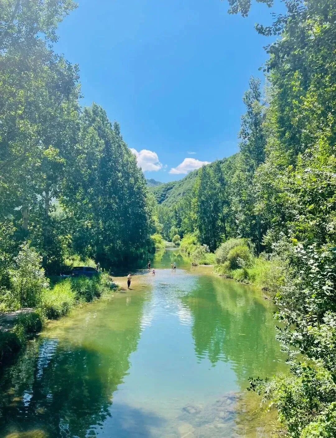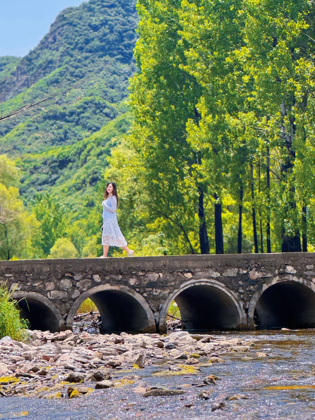 - 10:00|到达徒步起点在领队的带领下开始徒步。沿途风景一路沿着蜿蜒的白河前行,河水清澈见底,波光粼粼 。远处山峦连绵起伏,绿树成荫,呼吸着清新的空气,整个人都被治愈了 ,中途会经过好几座多孔桥,站在桥上拍照特别出片,分分钟拍出大片感。还有很多地方可以下到河边,近距离接触清凉的河水,夏天来还能玩玩水,超级惬意。白鹅戏水、羊群踏溪,转角遇见玉米地和瀑布,妥妥治愈系风景。 沿着步道大概13公里左右,无爬升小朋友也能轻松走完。