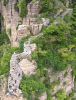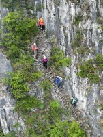 - 早6.00起床洗漱继续出发,10点左右抵达河南清水庄,整装开始徒步。龙水梯村海拔约1千米,在村口石桥右侧上行,奔白云龛方向前行,树林阴翳,鸣声上下,过白云龛攀爬鸡冠梯是该路线最险峻的一段,垂直高度约300米,坡度近70度,手脚并用攀爬至峰顶,群峰扑面而来,庄严而震撼。前行至十字岭十字路口,左行35分钟到达十字岭主峰海拔1778 米,为南太行最高峰,随着山势不断拔高,平缓的羊肠小道消失了,出现在眼前的是用不规则的石板铺成的石阶。这就是龙水梯了。我于前年曾经走过龙水梯,这次,算是故地重游了。龙水梯也是南太行一条经典的徒步线路。时值节假日,前来龙水梯徒步的其他户外的驴友也很多,一路上到处都是,颇为热闹。下午经过十字岭横切,进入锡崖沟村,安排住宿。若时间足够可自行前往锡崖沟挂壁公路,原路折返。