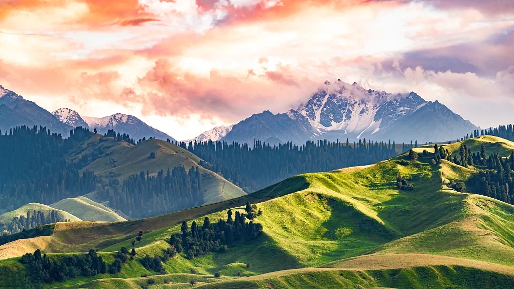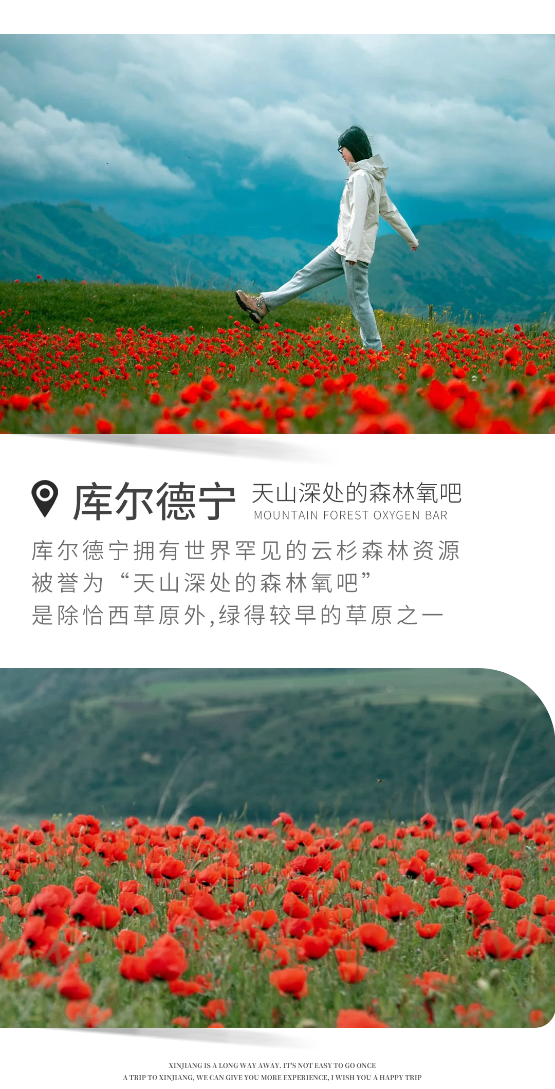 随后前往库尔德宁,库尔德宁虽处雪山脚下却能避免遭受雪山谷风的直接冲击。于是谷中终年温和,冬暖而春早,植物生长期较长,故有“暖谷”之称,春满四月天之时,天山其他地方才吐草芽,而此处却已绿草如茵、鲜花成海了。一到春天,漫山遍野都是鲜花,宛若仙境,由野苹果、野核桃、野生欧洲李、野杏等不同果树组成,这些野果林中,有不少野生果树属于珍稀物种。