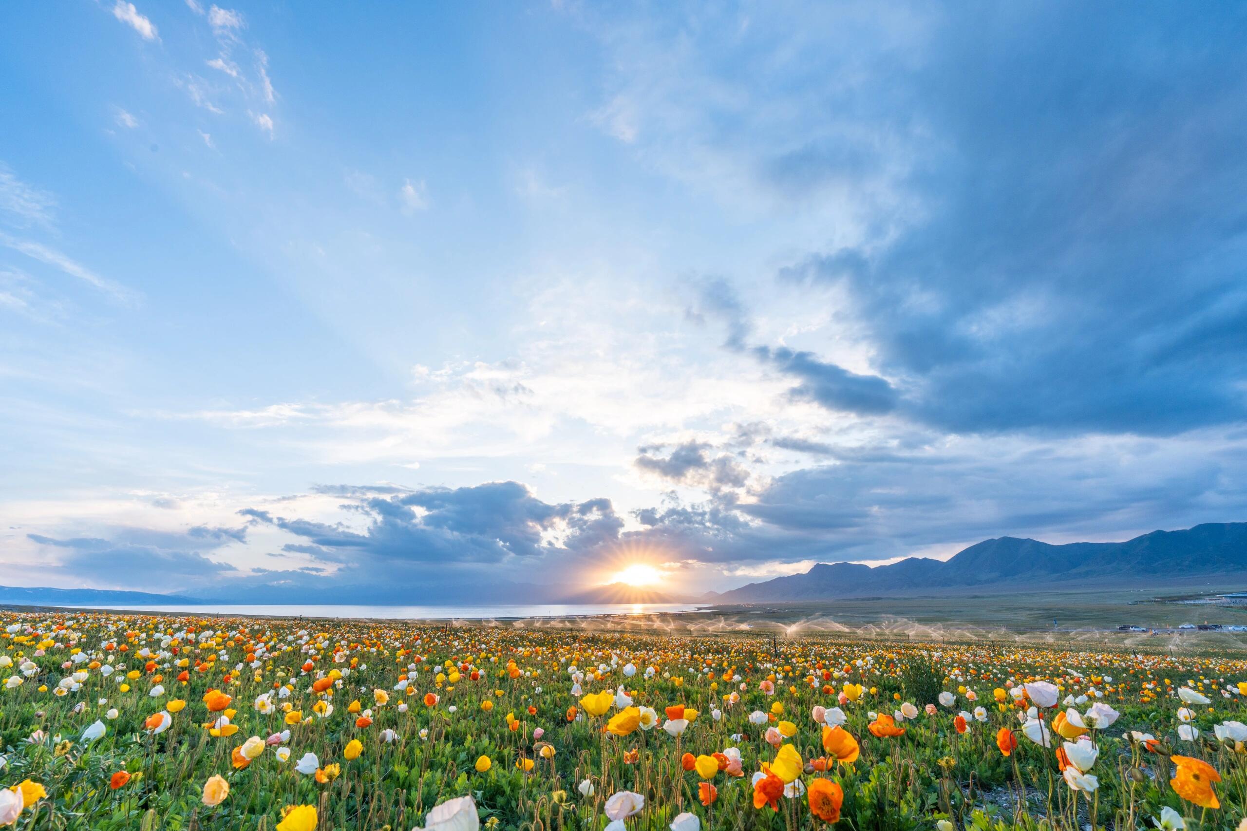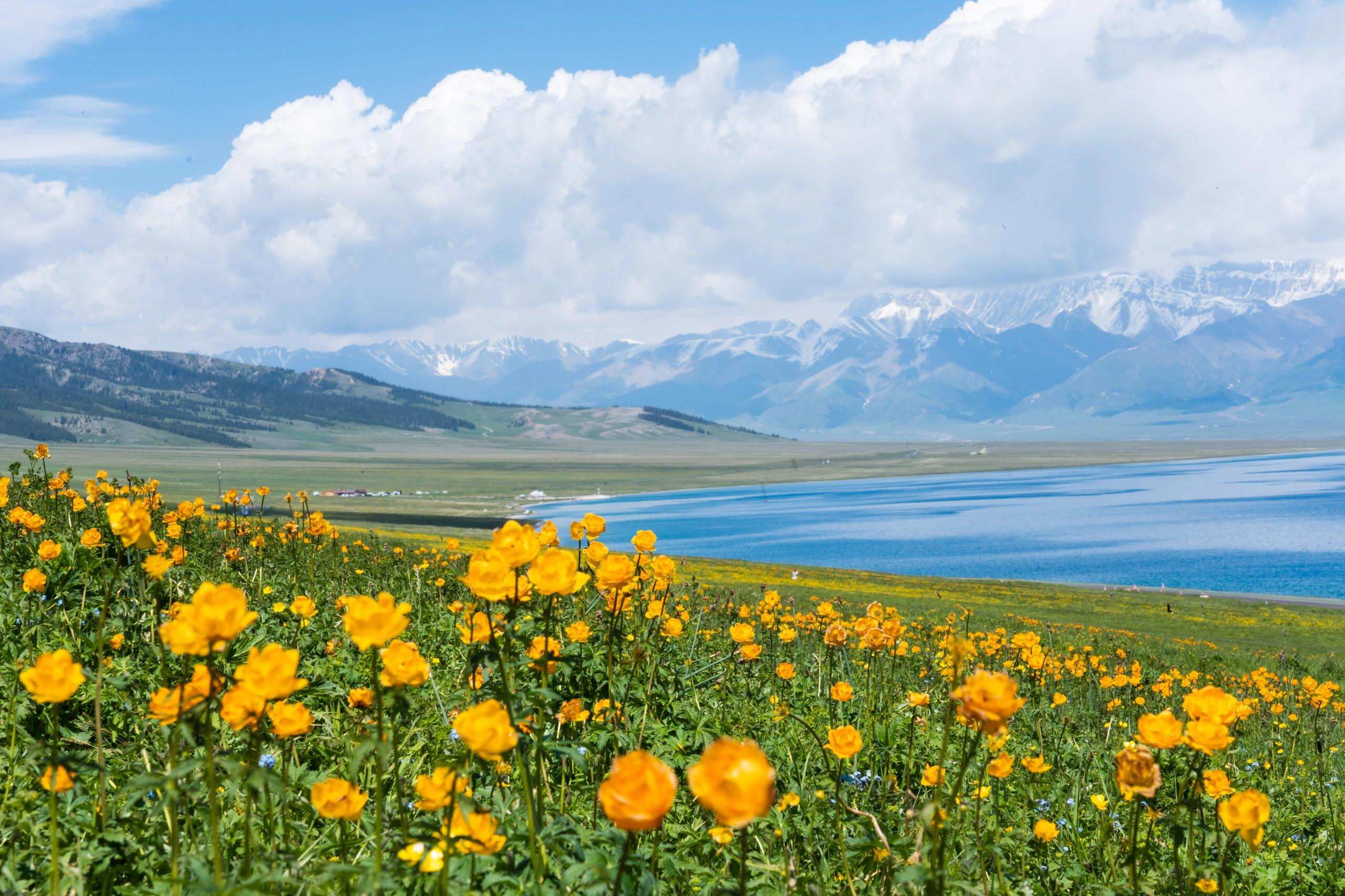 此时的赛里木湖西海岸的五颜六色的野花也正在相继绽放,如金莲花、郁金香、格桑花等,形成了花海,此时的赛里木湖将是人人向往的仙境。