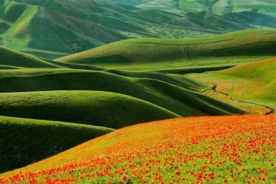 今早我们前往寻找红花,伊犁是天山红花的故乡。霍城县的三宫乡,满江沟,大西沟乡,萨尔布拉克镇这几个地方每年5月各处的天山红花竞相开放,鲜红似火的花朵在绿茵茵的草原上争先怒放,草原、红花、雪山和成群的牛羊相映成趣,染红了塞外江南新伊犁红红火火的五月。今天我们就驱车前往寻找,根据出发时间选择最漂亮的赏花地,红红的花远处有层叠的大东沟山脉和清晰可见的科古尔琴雪峰,碧蓝的天和多变的云,真是美爆你的双眼,浸染你的心田!