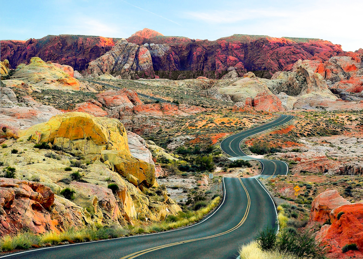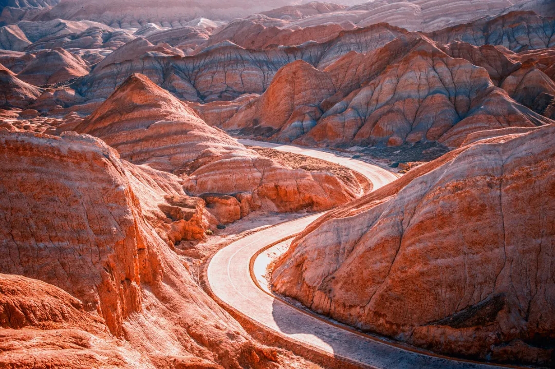 随后将前往网红公路,就是号称天山北麓景观地理画廊的【101丹霞公路】。这里的地貌为地震断裂和风蚀地带,各色岩石、黄土构成了壮美的峡谷风光。与张掖的丹霞地貌相比,七彩山峡谷的色调没那么浓烈,红是浅浅的红,紫也是淡淡的紫,连山脚下的黄土也没有那么明丽。连绵起伏的丹霞地貌、形态各异的侏罗纪山系,各色岩石,黄土构成了壮美的峡谷风光,峭壁悬崖,层层叠叠。今天一路走走停停,尽情拍摄。