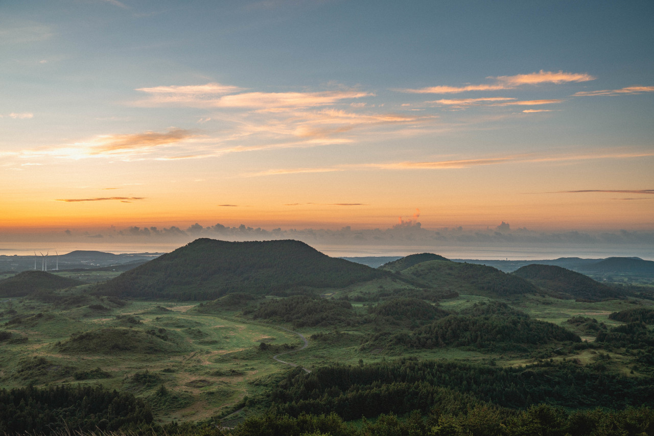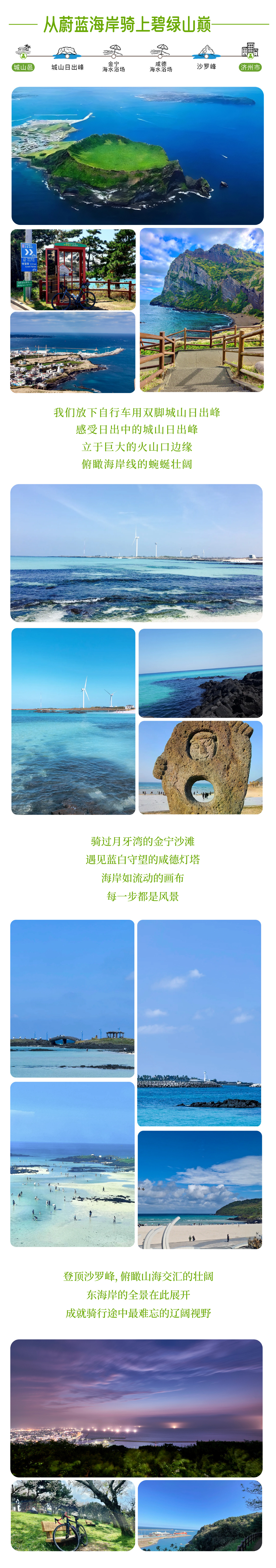 来到城山日出峰,一定要体验一下日出中的日出峰,早起登顶个日出峰,然后从城山出发,迎着朝阳沿滨海公路骑行,首站抵达金宁海水浴场。这里以月牙形的沙滩和清澈的海水闻名,沙滩细腻柔软,是放松身心的好地方,可在此稍作停留,感受海风的轻抚。接着前往咸德海水浴场,蓝白相间的灯塔是这里的标志性景观,搭配上湛蓝的海水和洁白的沙滩,宛如一幅清新的油画,吸引着众多游客驻足拍照。之后继续骑行,挑战沙罗峰,站在山顶可俯瞰济州岛东海岸的壮丽景色,山海相连,美不胜收。傍晚时分,骑行至济州市,完成环岛骑行之旅,晚上一起大餐庆祝。