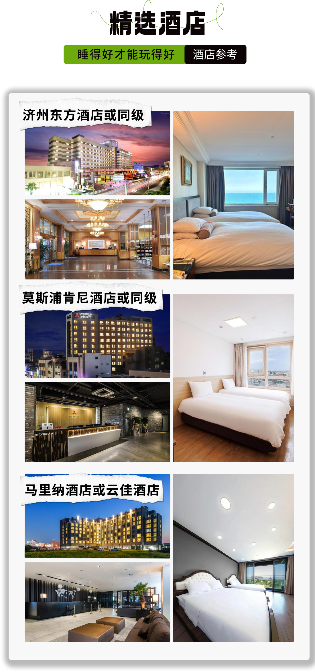 住宿:2晚济州市高档型酒店、1晚莫斯浦舒适型酒店、1晚城山舒适型酒店,单人报名同性拼房2-3人间;