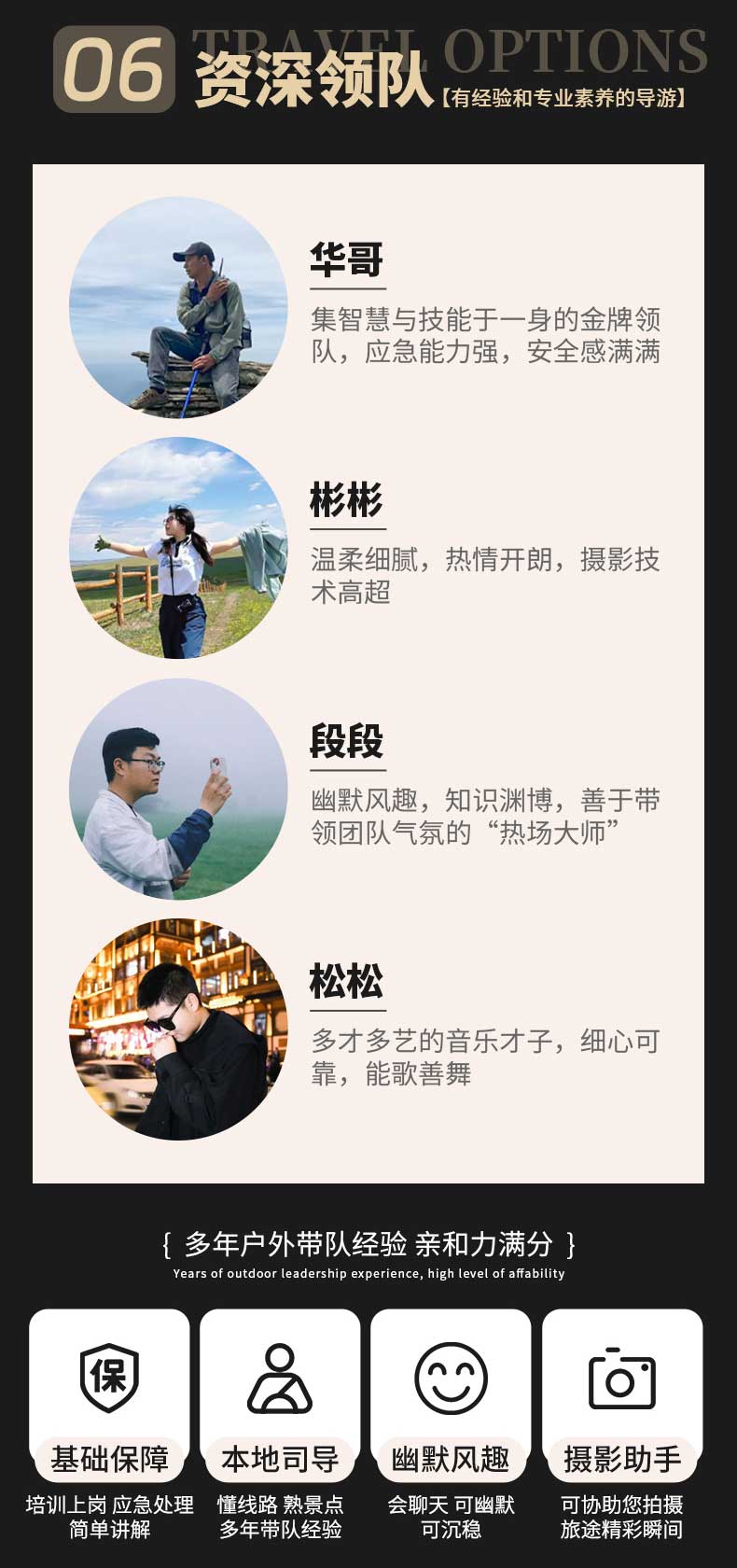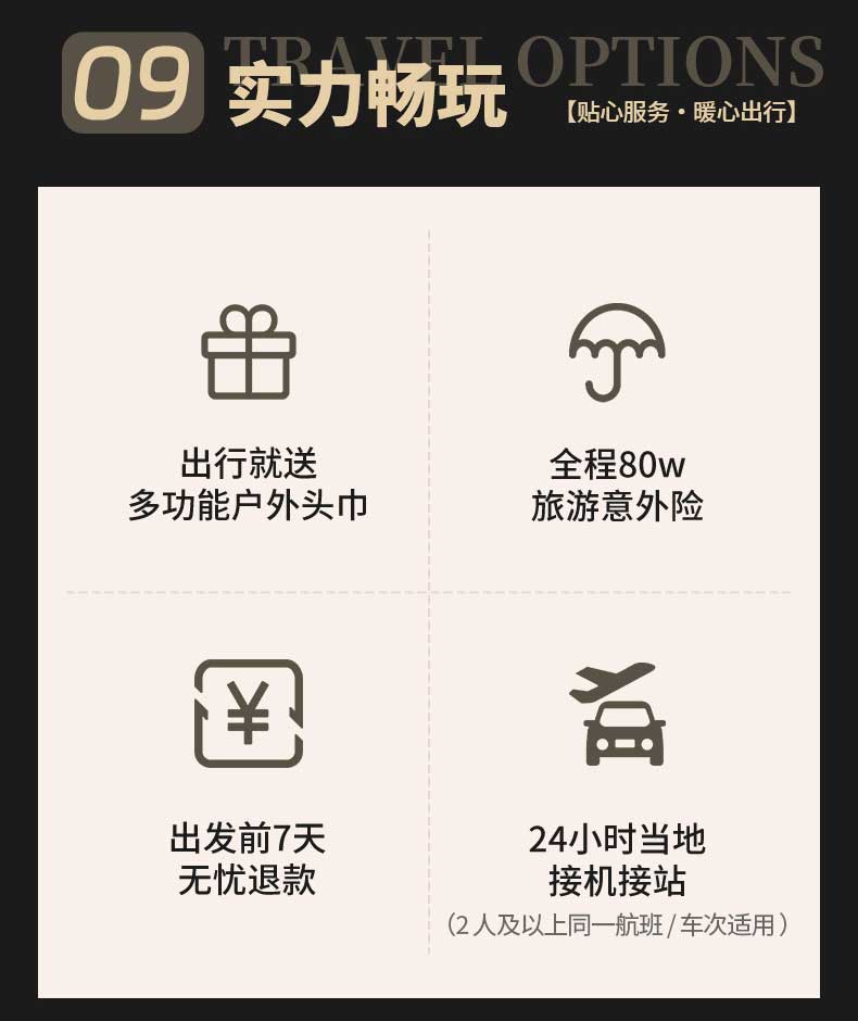 私家团可不限人数成团,指定任意时间成团,服务标准与以上排期产品等同,如需摄影航拍、人文精讲、在地体验等升级服务,可联系客服提供专属定制旅行服务