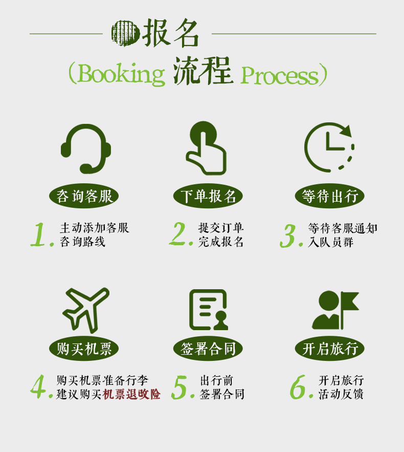 活动成团说明: A.我们会在第一时间通知成团信息,最晚会在出行前7天通知; B.若人数不足成团标准,可改期至其他日期或无损退团退款: C.建议小伙伴们报名活动确认成团后,再购买大交通,以避免不必要的损失。 |