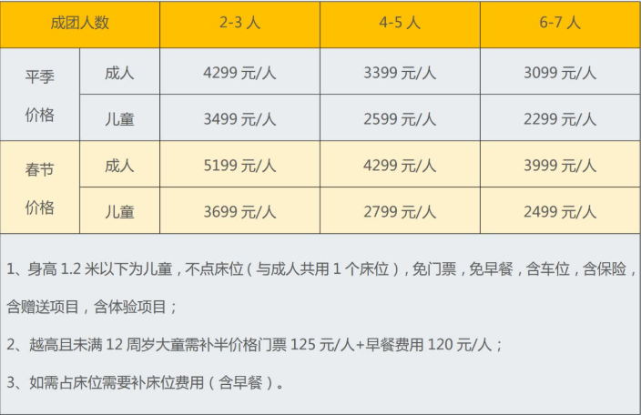 身高1.2米以为儿童,不占床位(与成人共用1个床位),免门票,免早餐,含车位,含保险,含赠送项目,含体验项目;