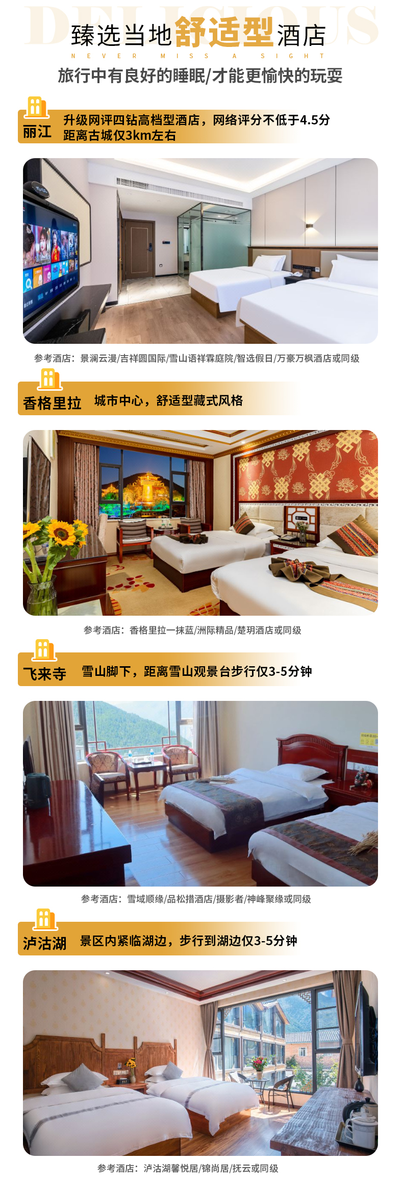 2、住宿:全程5晚优选当地酒店(丽江2晚四钻高档型酒店,德钦1晚舒适型酒店,香格里拉1晚舒适型酒店,泸沽湖1晚舒适型酒店);