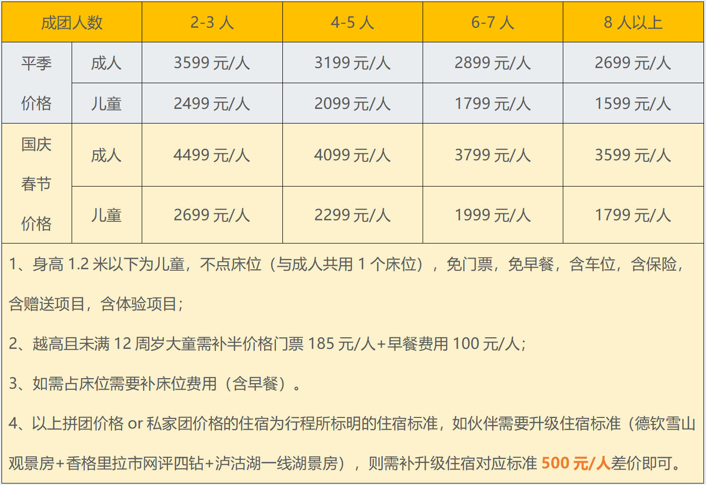 ▷房差:自然拼房2-3人标准间,如不愿拼房或拼不了房者须补单房差(平季600元/人,暑期1000元/人,国庆/春节1500元/人);