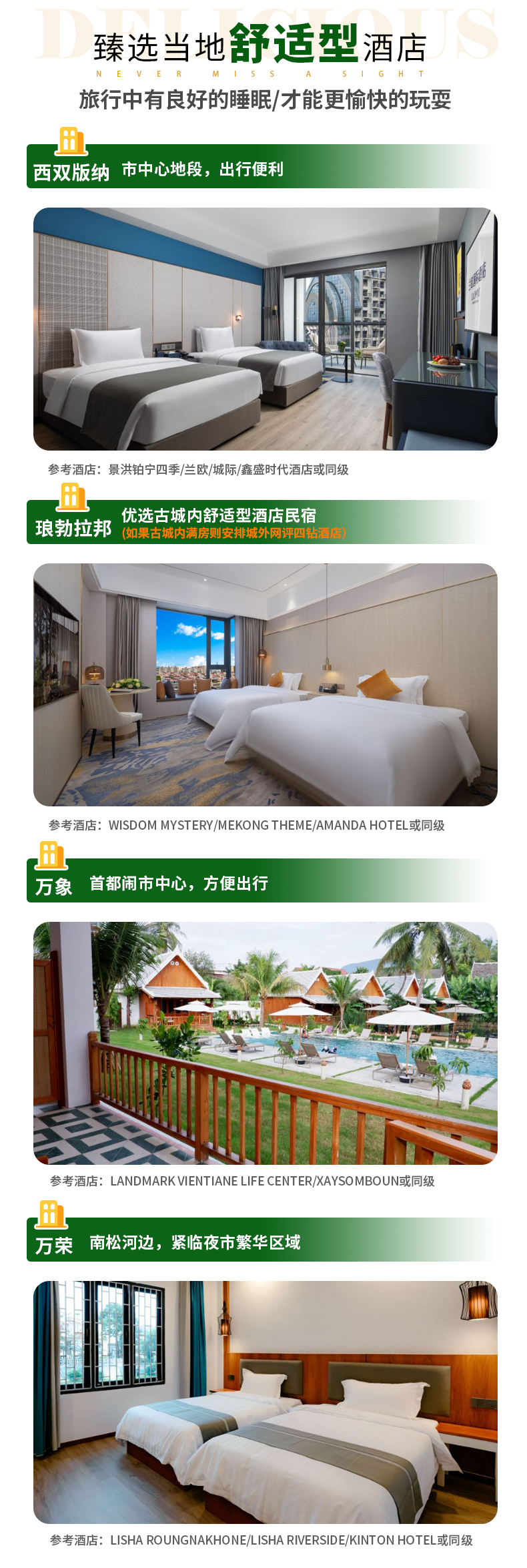 2、住宿:行程所列西双版纳2晚网评四钻高档型酒店+老挝琅勃拉邦+万象+万荣当地4晚网评四钻精品酒店;
