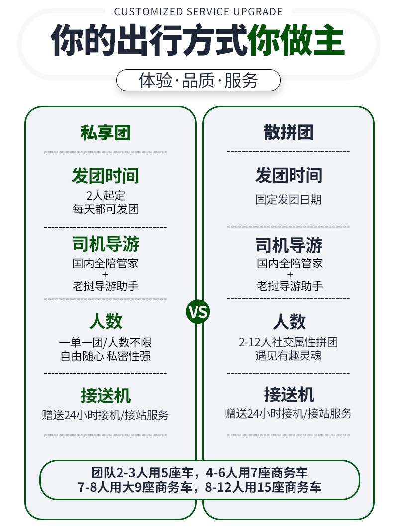⑤本产品根据人数安排车辆,不指定车型,若客人指定车型,需加收相应车费。
