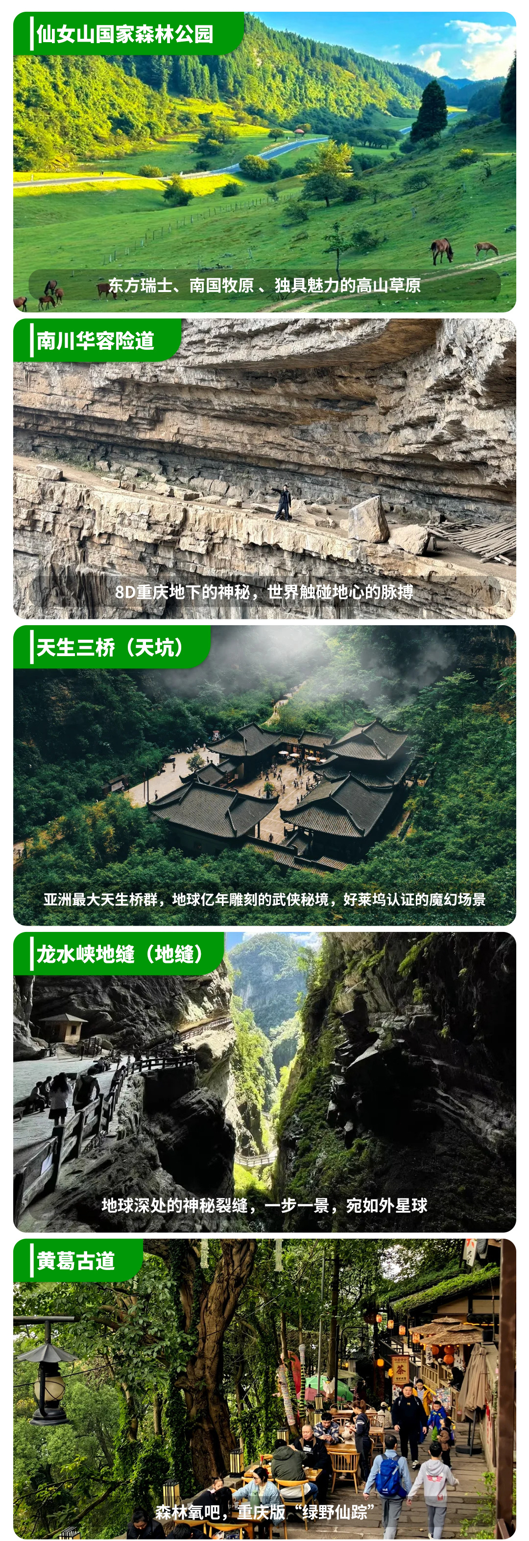 4、门票:仙女山大门票、天生三桥门票+中转车+电梯、龙水峡地缝门票+中转车+电梯;