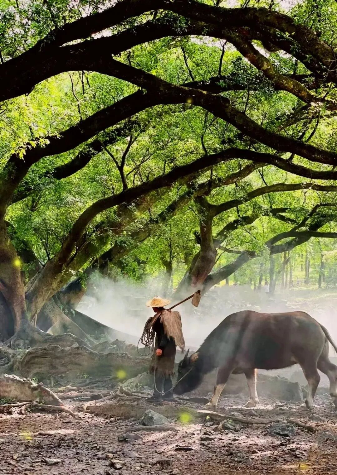 - 下午 前往杨家溪榕枫公园,古榕树虬枝伸展,遮天蔽日。古榕树下我们先安排老农牵牛拍摄:在古榕树下布置烟雾场景,阳光透过榕树间隙照射下来形成丁达尔光线,此时畲族阿婆挑担子,阿公牵牛配合拍摄;随后安排村姑赶鹅拍摄,这是杨家溪榕树下的新晋宠儿,村姑模样打扮的妇女赶着一群白鹅于榕树下觅食,憨态可掬的鹅群很是讨喜。