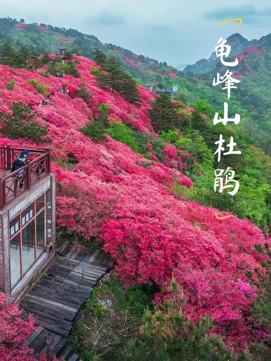 龟峰山巅,十里杜鹃织就烈焰红霞。万顷花海随峰峦起伏,似云锦倾泻人间。绯色波涛漫过青崖,晨雾中若隐若现的朱砂水墨,暮色里流光溢彩的珊瑚岛屿。千年古树缀满星子般的花苞,风过时簌簌抖落春的私语。这是大别山遗落的霓裳羽衣,每片花瓣都镌刻着时光的温度,让人恍若踏入羲和停轮的幻境,忘却尘寰。