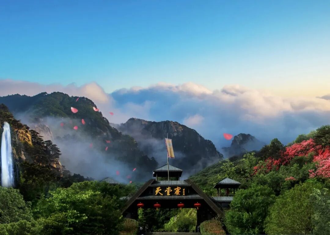 天堂寨古称“多云山”,位于安徽省六安市金寨县与湖北省罗田县交界,最高峰天堂寨(与景区同名,也叫天堂顶),为大别山第二高峰,古称“吴楚东南第一关”,亦有“华东最后一片原始森林、植物的王国、花的海洋”的美称。天堂寨所处的大别山,是中国南北水系的分水岭,山北水往北流注入淮河,山南水往南流注入长江。所以在天堂寨峰顶北可望中原,南可眺荆楚,海拔1729米的天堂顶有一口天塘,塘水不溢不涸,俗称“瑶池”。