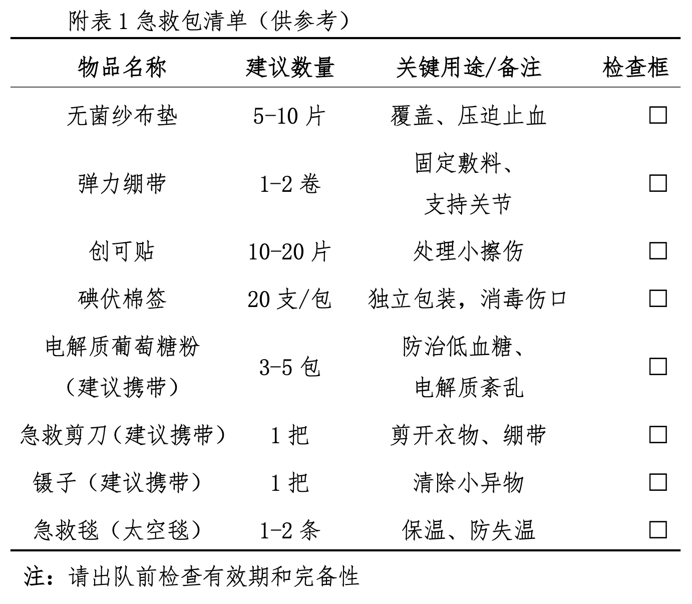 (四)急救包: 1 包。 定期检查包内物品 (具体见文末附表 1) ,确保无缺失、无过期。