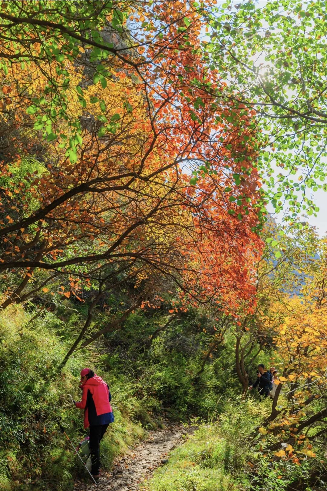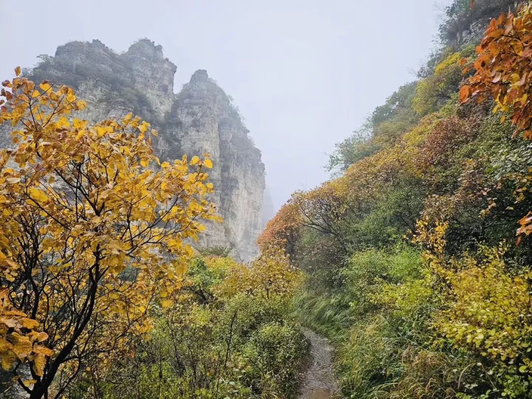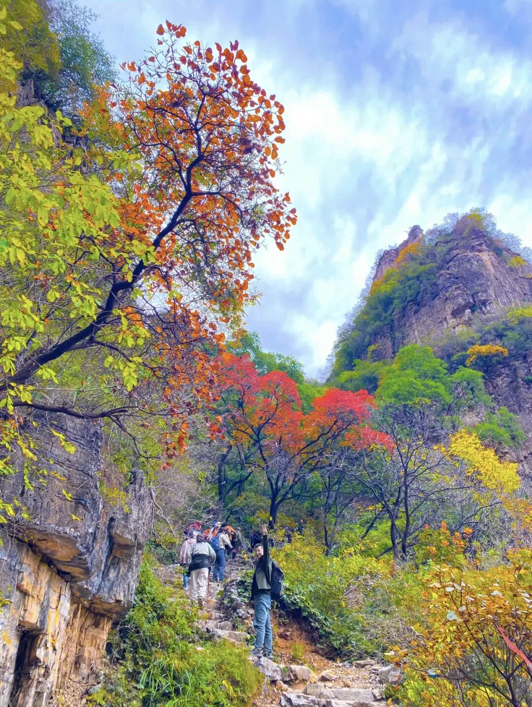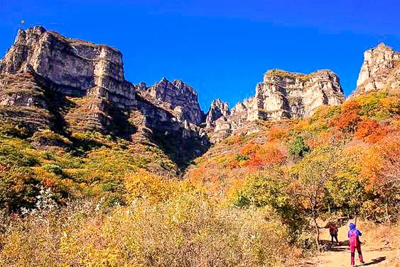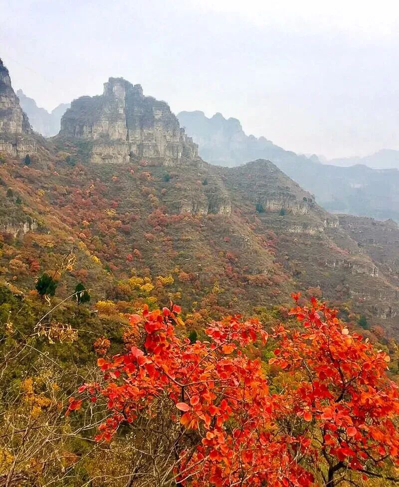 这里群山环抱,云雾缭绕,潺潺清泉,啾啾鸟鸣,无不令人心旷神怡。这里的秋色更是无可挑剔,枫叶像一面面小红旗在山间飘过;黄栌叶像一颗颗金黄的果实在树间摇动。山径曲折回旋,可沿路攀援,亦可独辟蹊径,山之巧然,尽孕其中。