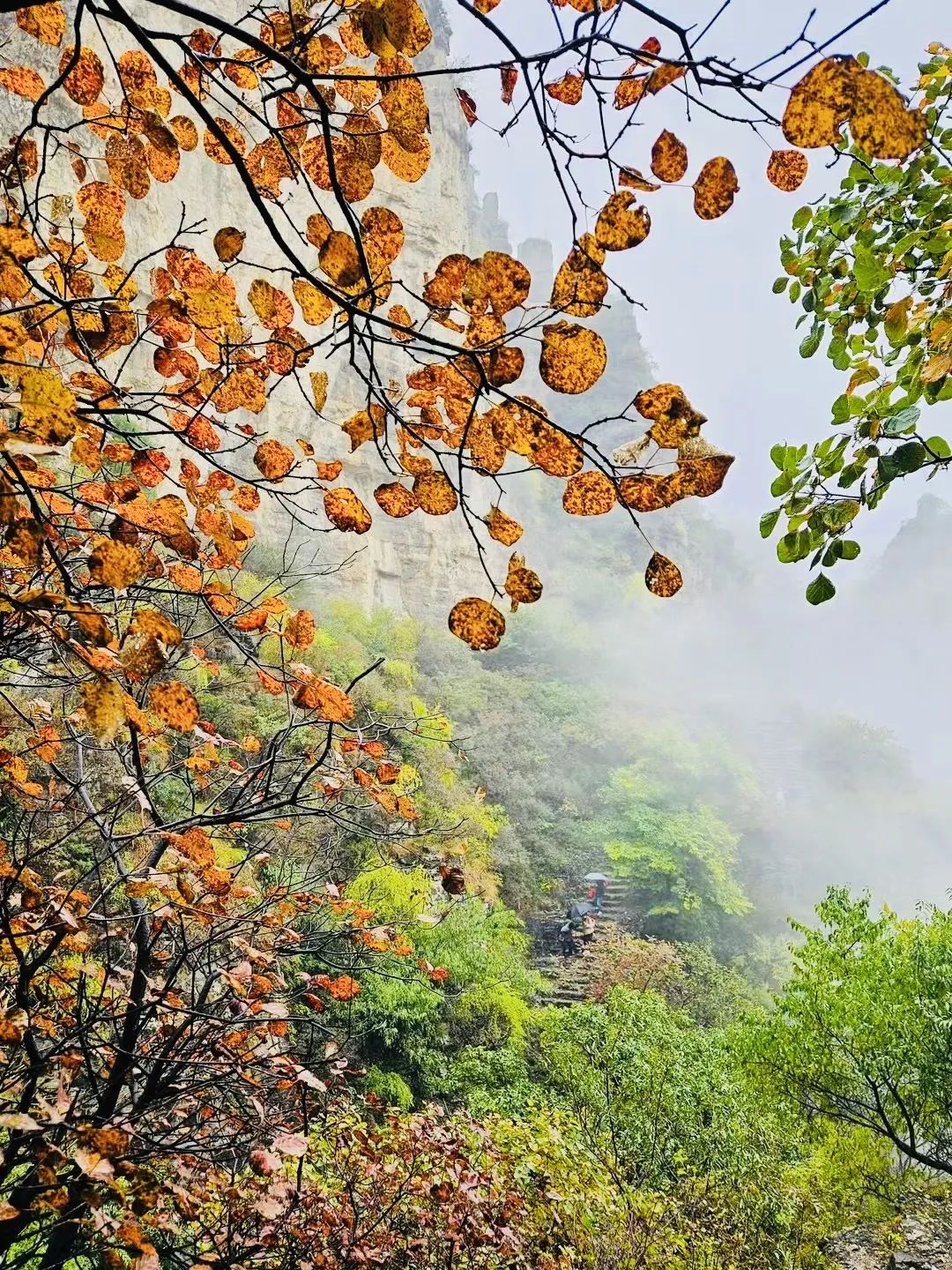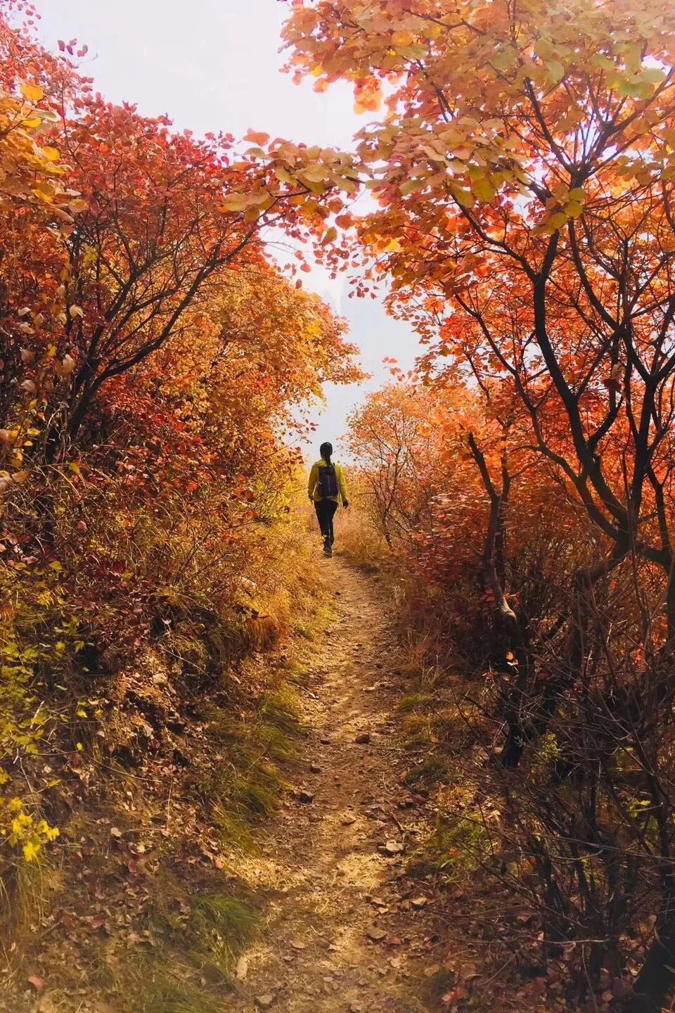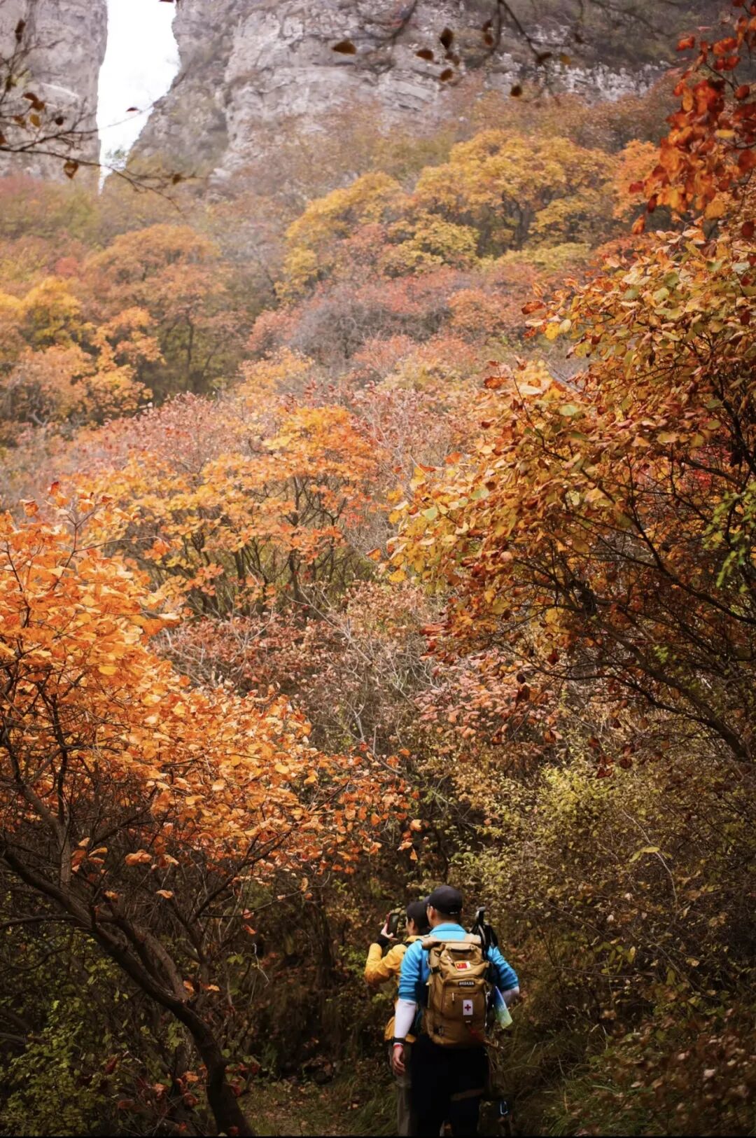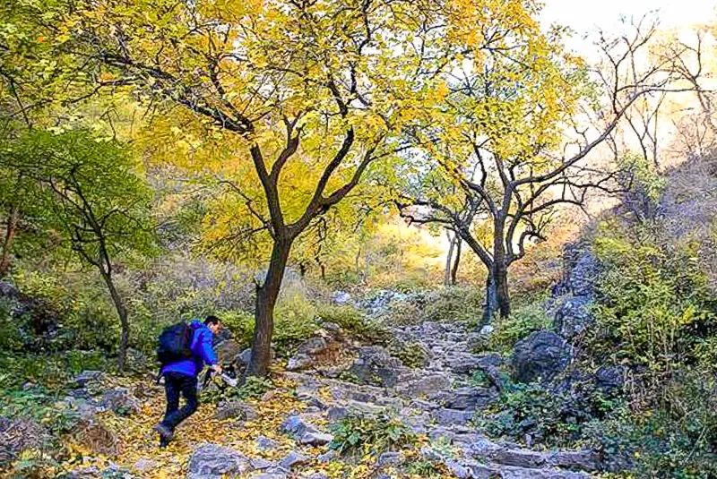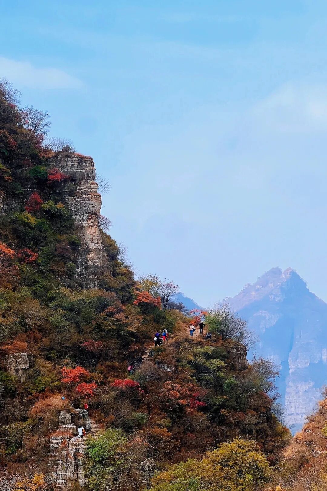 这里群山环抱,云雾缭绕,潺潺清泉,啾啾鸟鸣,无不令人心旷神怡。这里的秋色更是无可挑剔,枫叶像一面面小红旗在山间飘过;黄栌叶像一颗颗金黄的果实在树间摇动。山径曲折回旋,可沿路攀援,亦可独辟蹊径,山之巧然,尽孕其中。