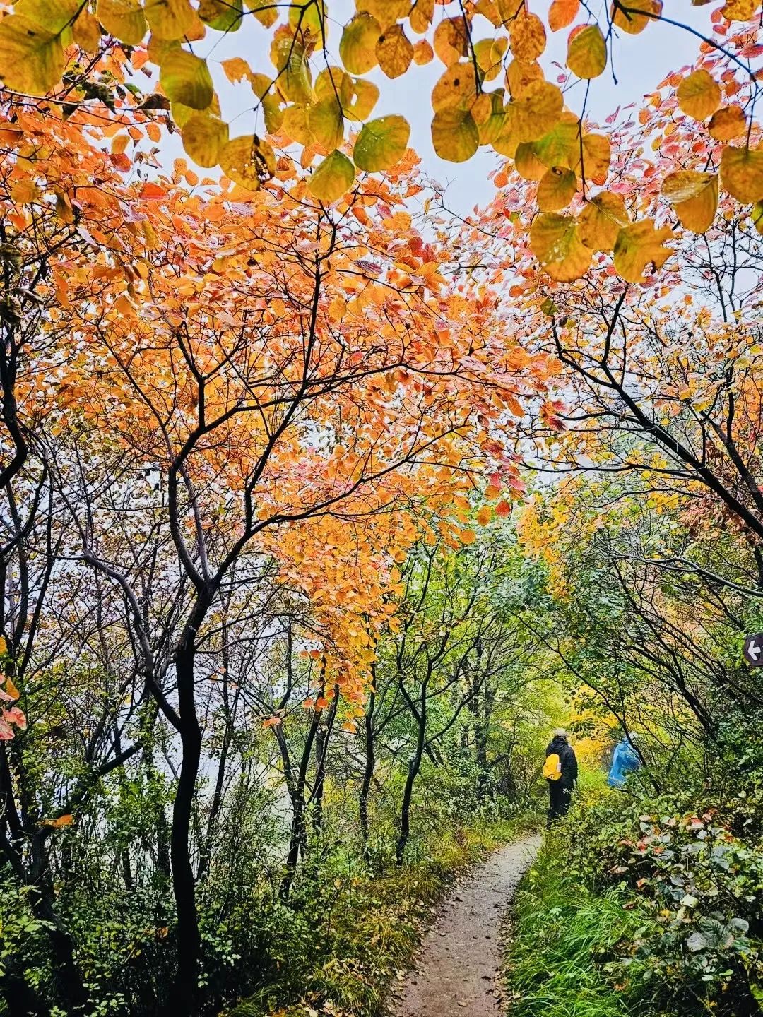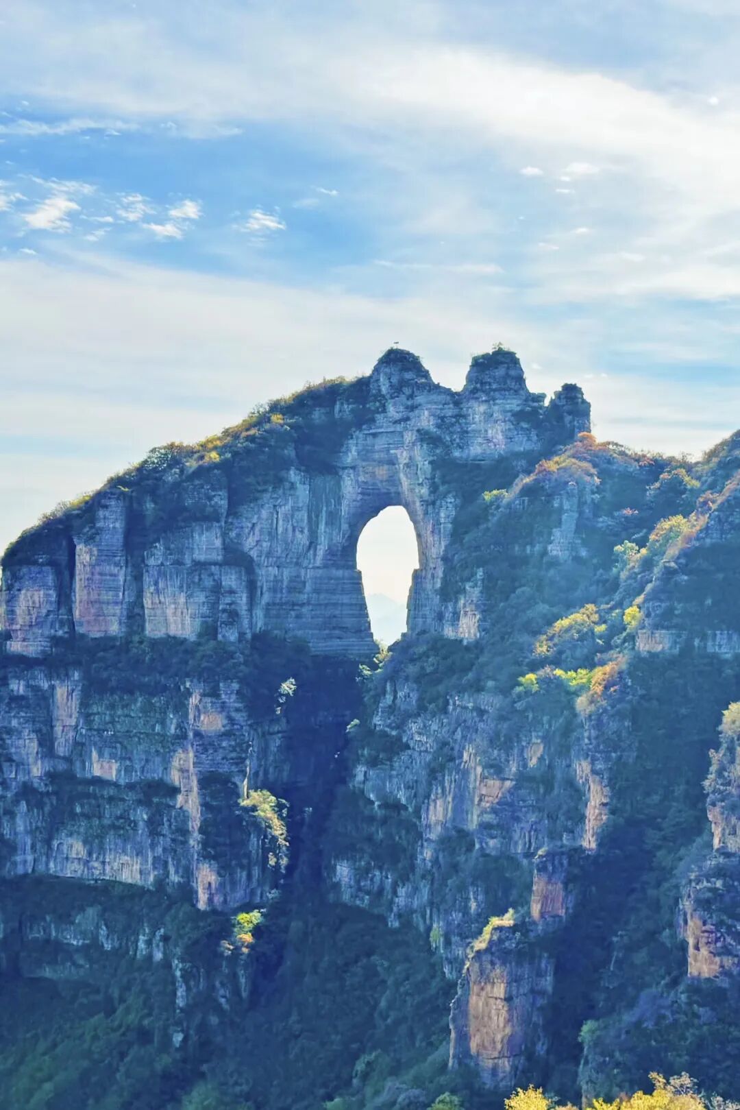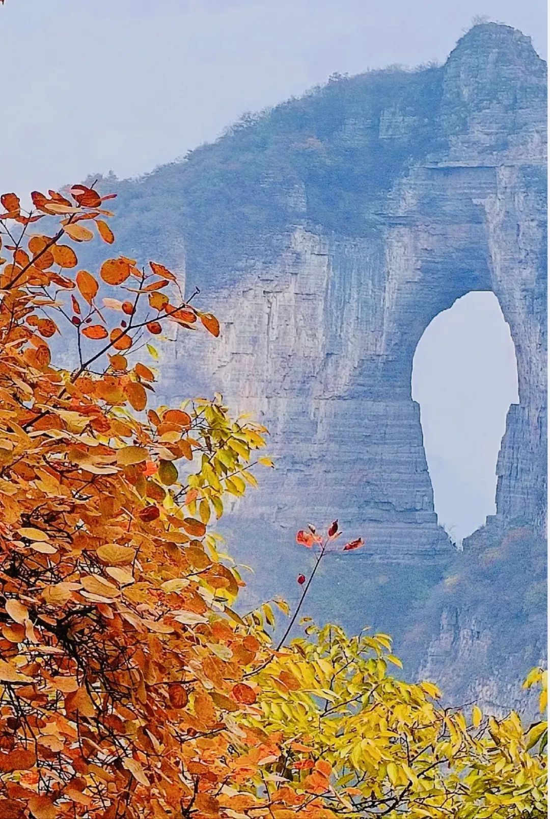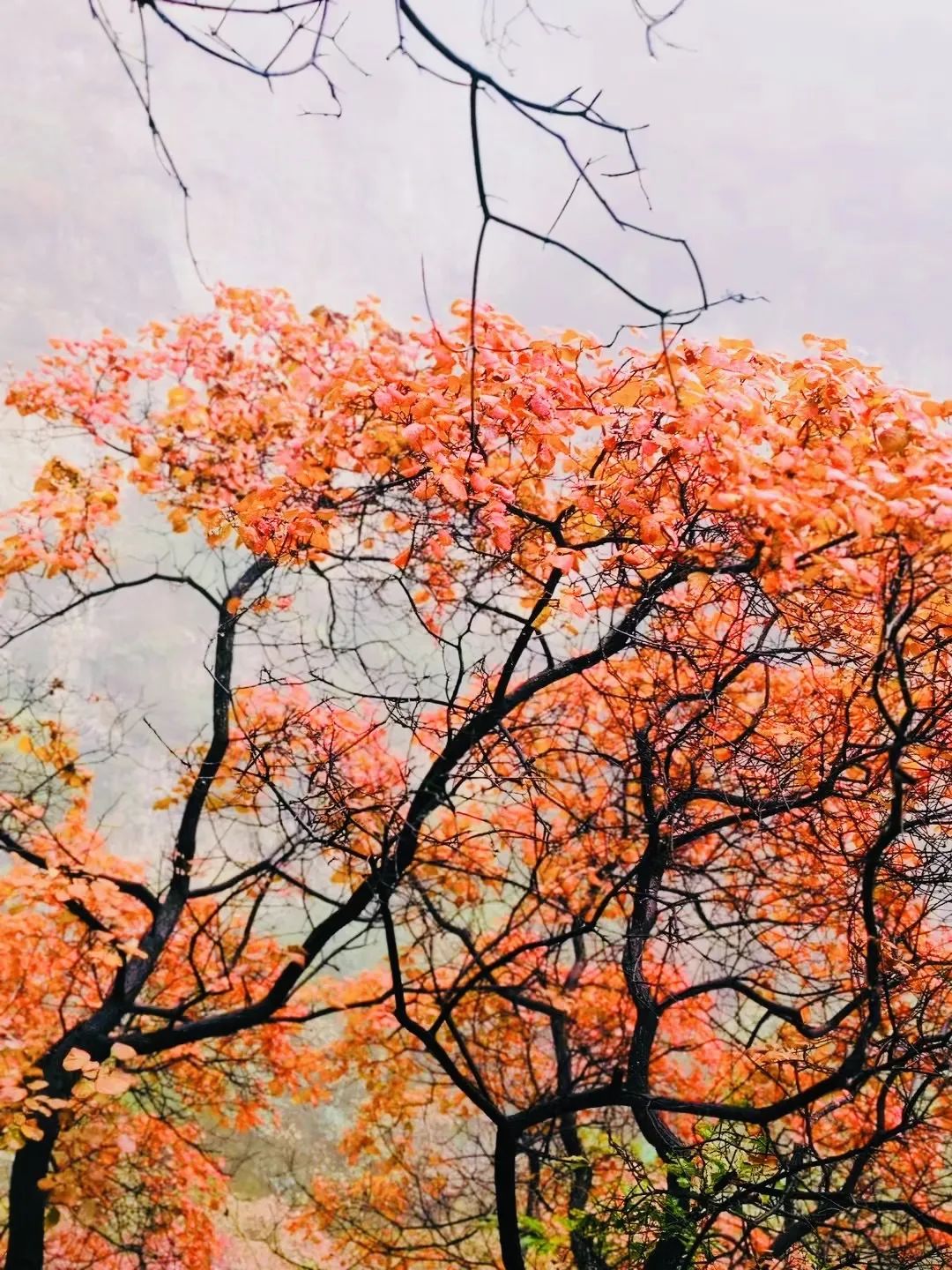 这里群山环抱,云雾缭绕,潺潺清泉,啾啾鸟鸣,无不令人心旷神怡。这里的秋色更是无可挑剔,枫叶像一面面小红旗在山间飘过;黄栌叶像一颗颗金黄的果实在树间摇动。山径曲折回旋,可沿路攀援,亦可独辟蹊径,山之巧然,尽孕其中。