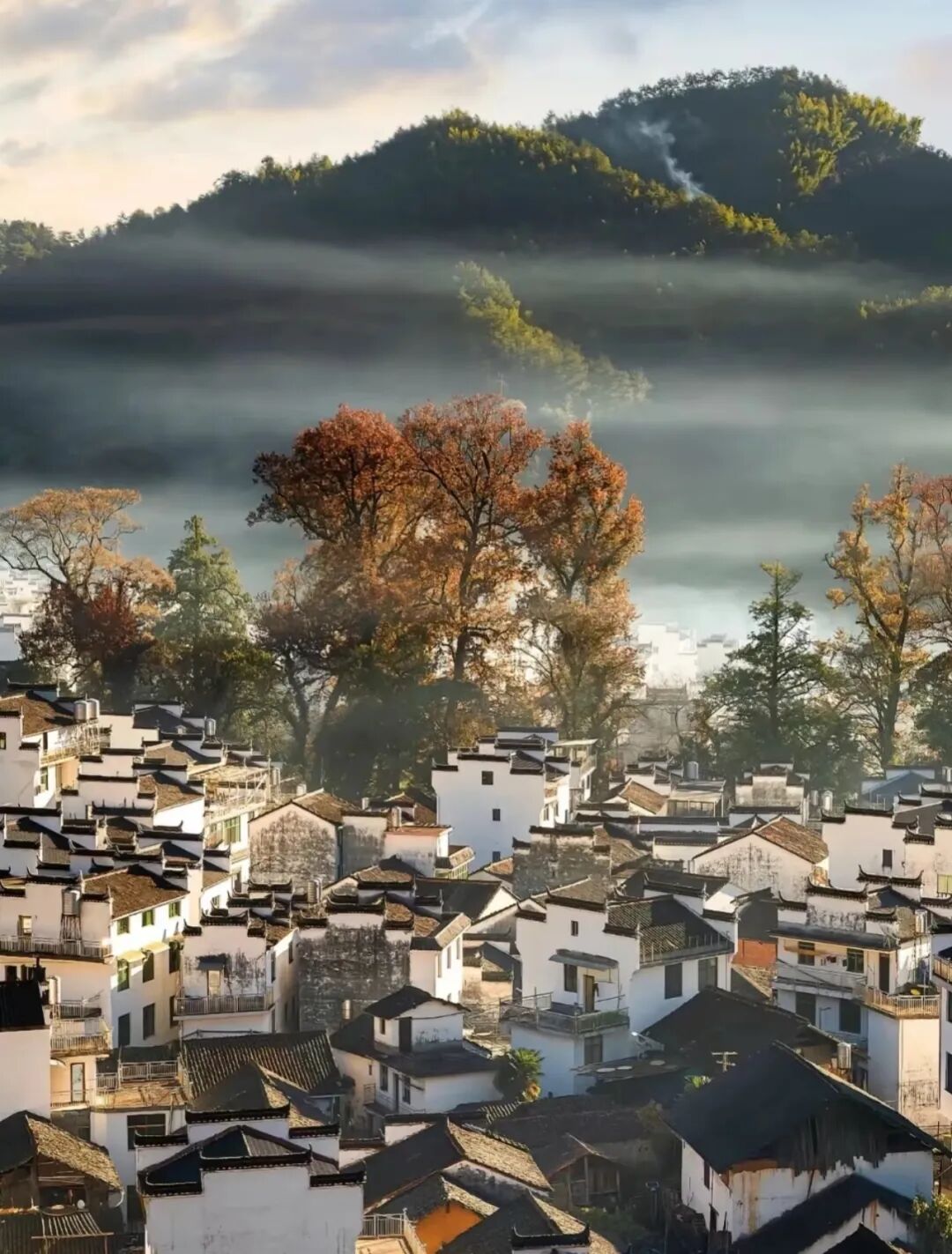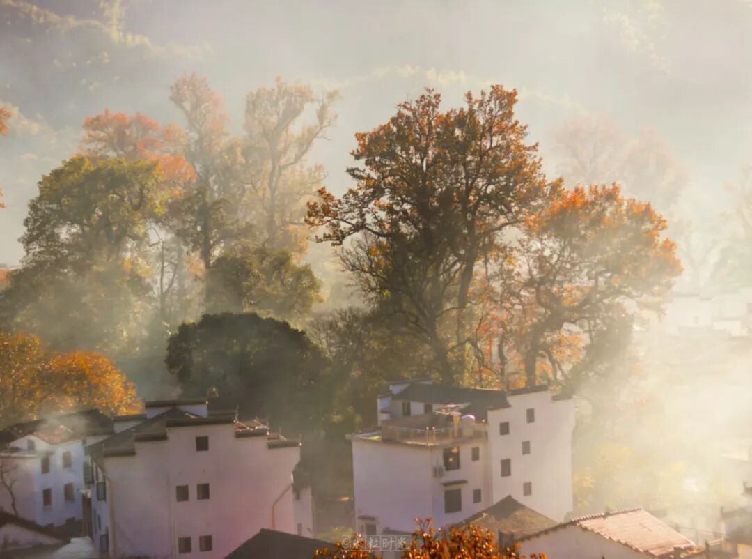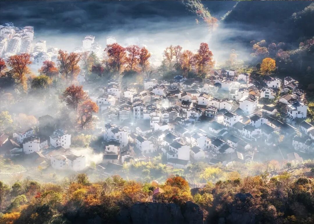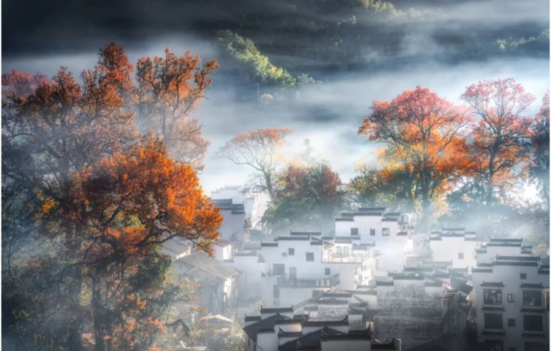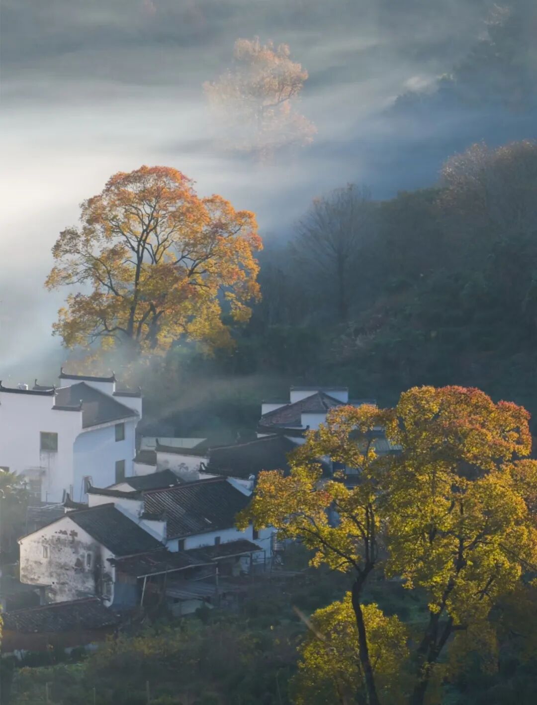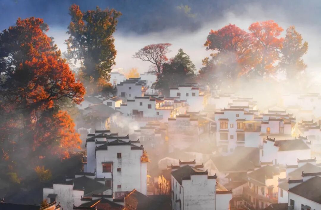 【石城晨雾】 石城是婺源看秋色比较有名气的地方,源于的村落和红叶景观。灰白的民居与枫林交相辉映,形成了秋季婺源乡村别样的风光。几百株香枫树顶上的枫叶,由浅到深的颜色变换。形成了,层林尽染的美景。清晨雾气或炊烟中的火红枫树简直就美得不像人间植物了。