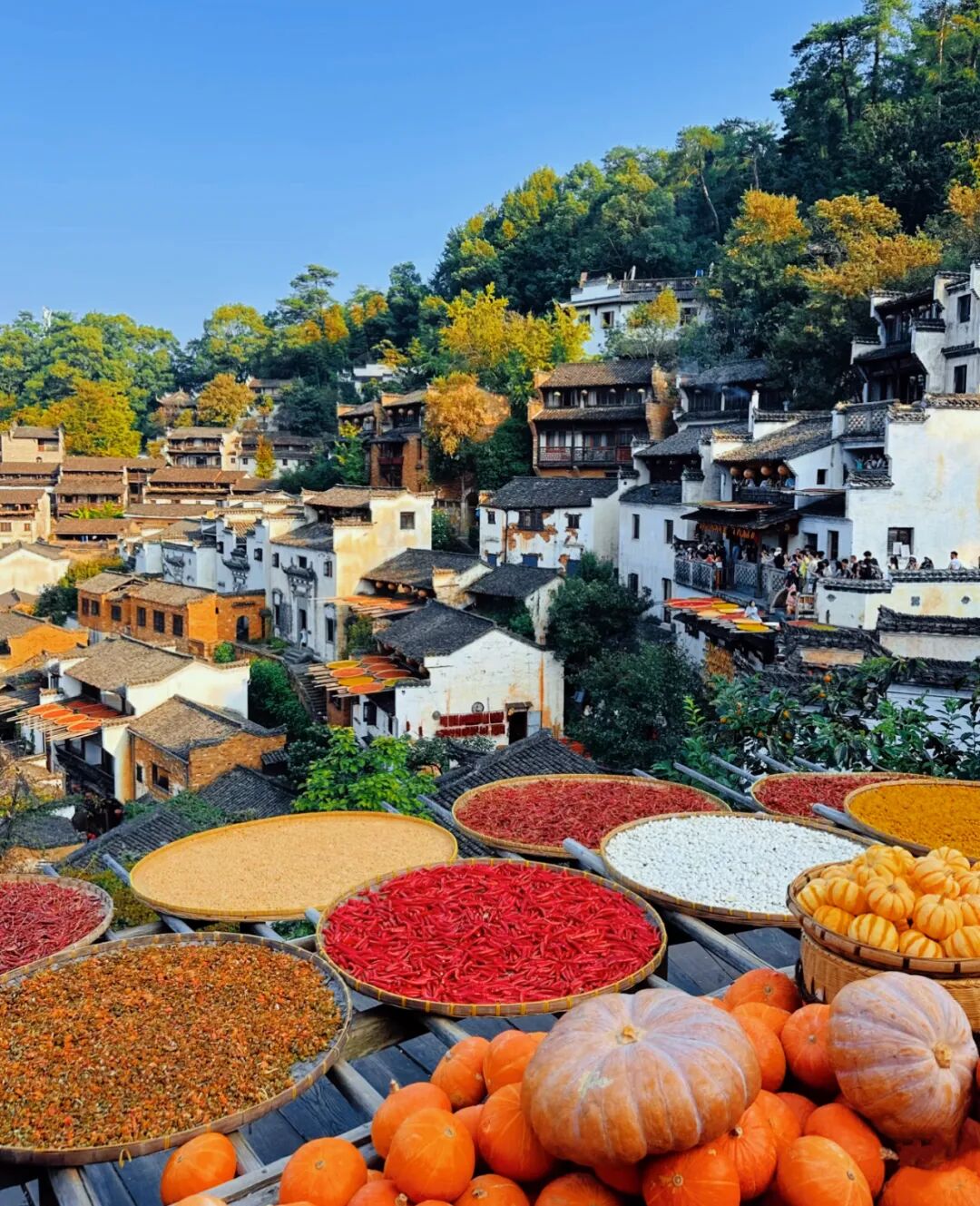 来婺源赏秋都会到这来欣赏这里秋天的特色“篁岭晒秋”!