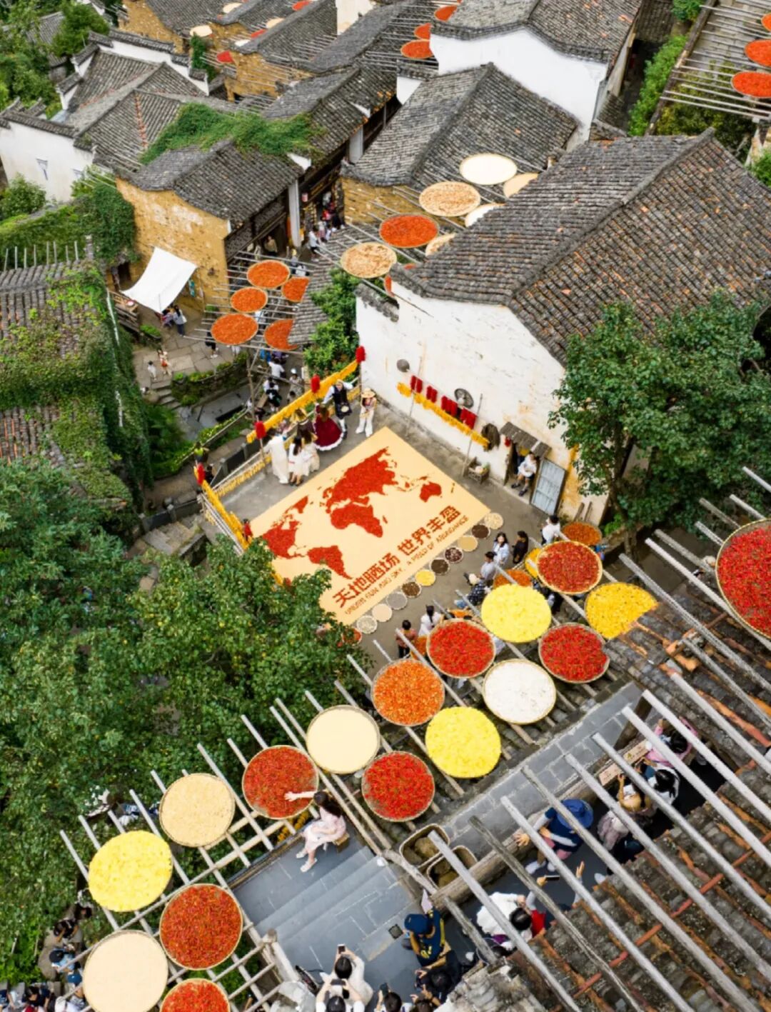 【篁岭晒秋】 挂在山崖上的篁岭古村,“地无三尺平”,数百栋徽派民居在百米落差的坡面错落排布,每当日出山头,晨曦映照,整个山间房屋晒架上五彩缤纷的丰收果实,绘就出美丽的“晒秋”农俗景观。春晒茶叶、夏晒山蕨、秋晒果蔬、冬晒乡俗……一年四季延绵有续。“晒秋”是篁岭古村500年来延续至今的晒谷物特色民俗景象。它反映了以篁岭为代表的山居民众原生态的晒物农俗,是劳动人民对丰收喜庆和未来生活所赋予的质朴美好的期待,并逐渐沉积为一种民俗和文化。