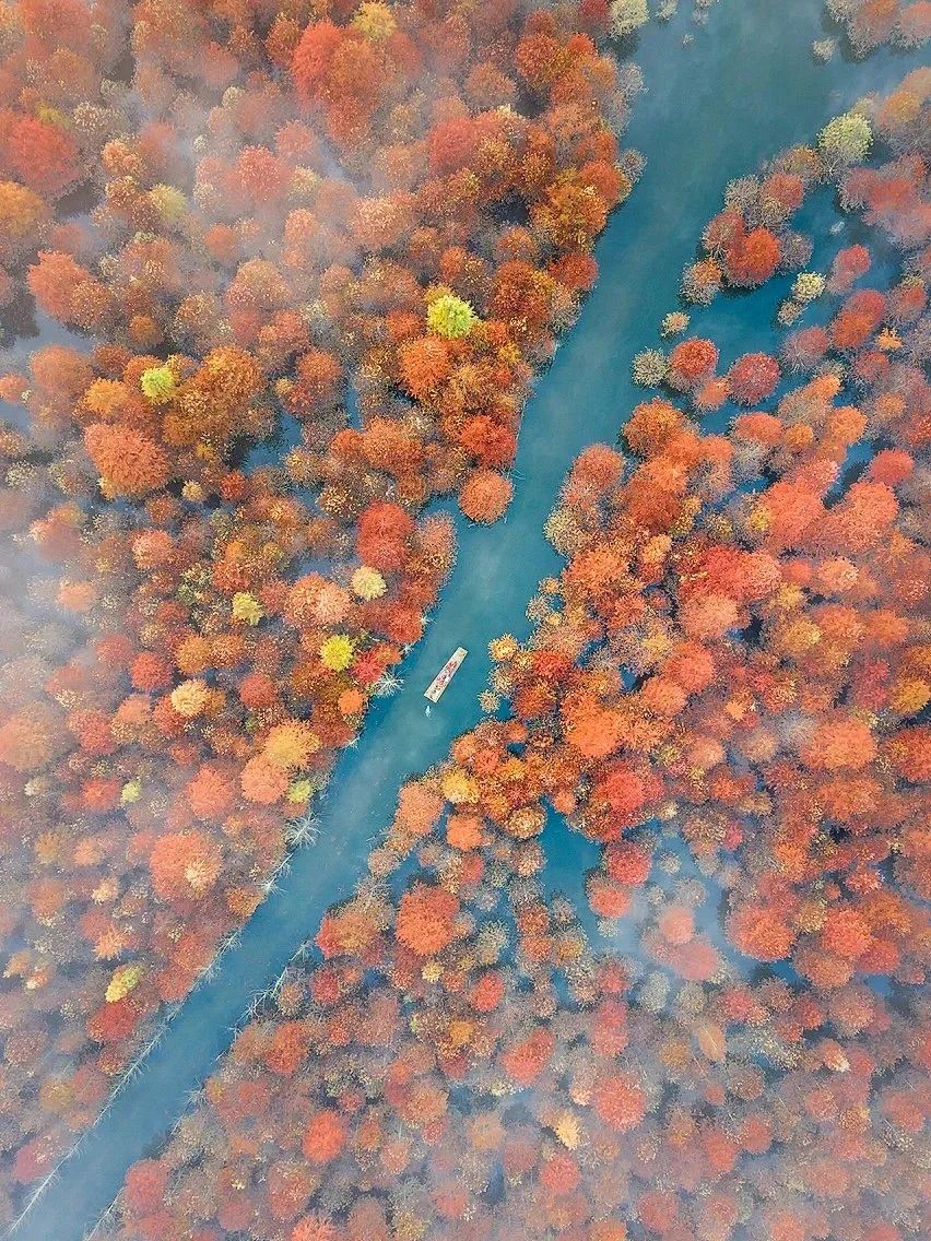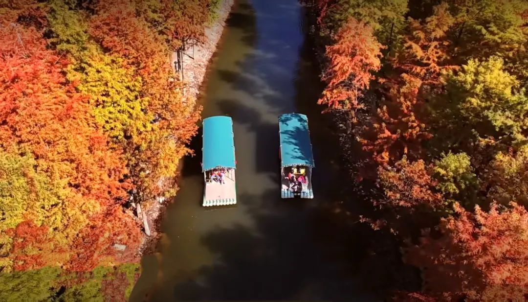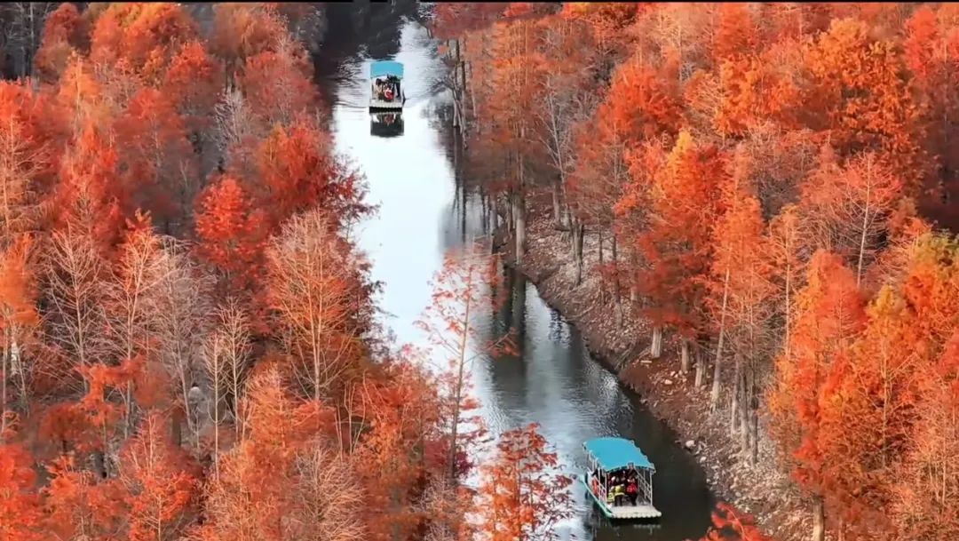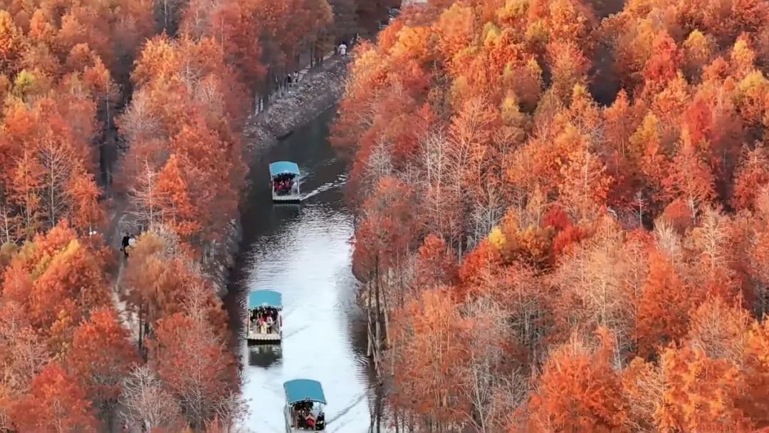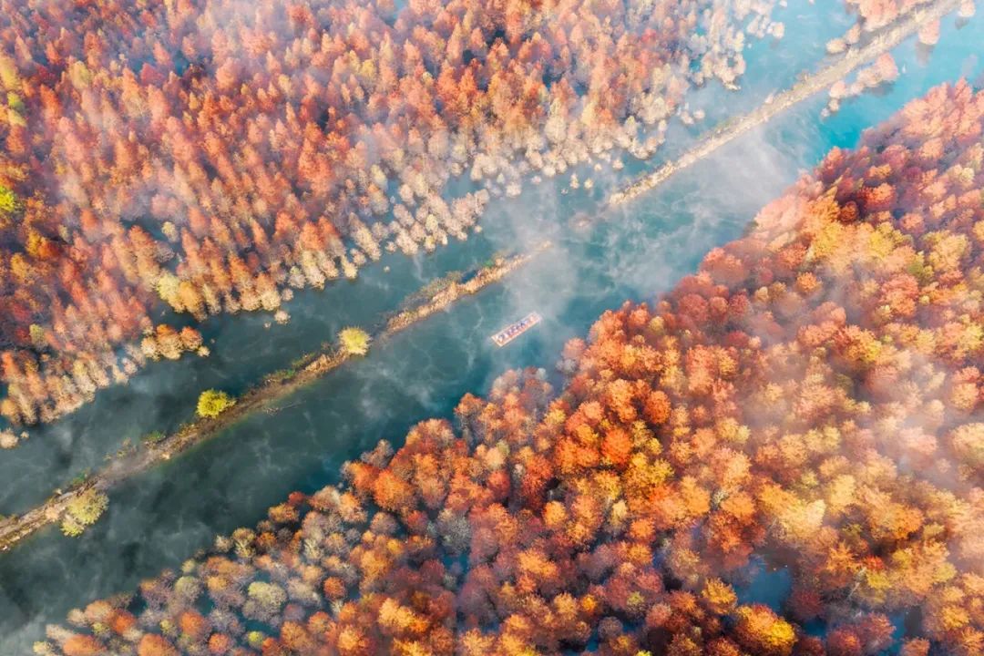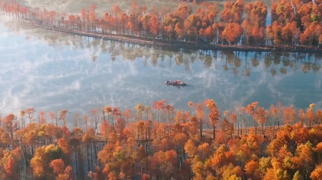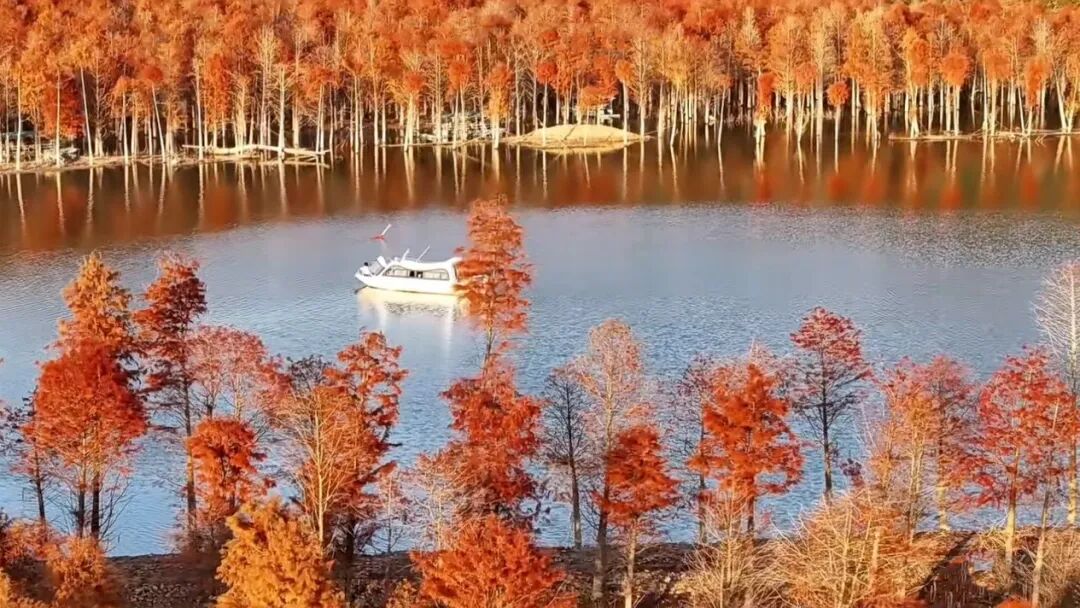 两千余亩落羽杉(红杉林)错落有致地立在水中,与宽广碧绿的水面相互映衬。每到深秋,红杉林渐次变红,各种颜色相互交织着,色彩绚丽,宛如皖。树林里,游船穿梭,南的“喀纳斯”水光舟影,如诗如画,美不胜收。游览秋色落羽杉公园的最佳时间是每年的11月下旬至12月上旬。