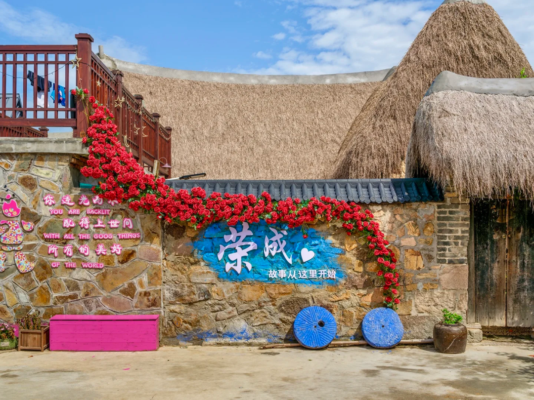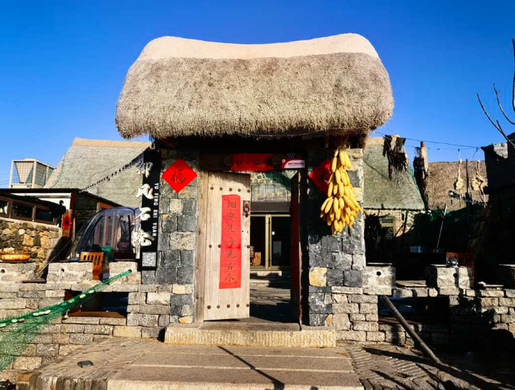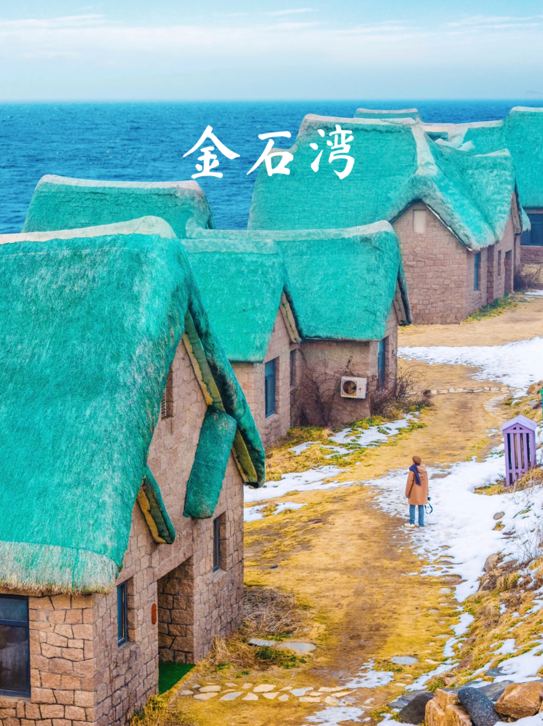 - 之后前往金石湾游览,闯入宫崎骏动漫里的海边小屋,打卡特色海草房。