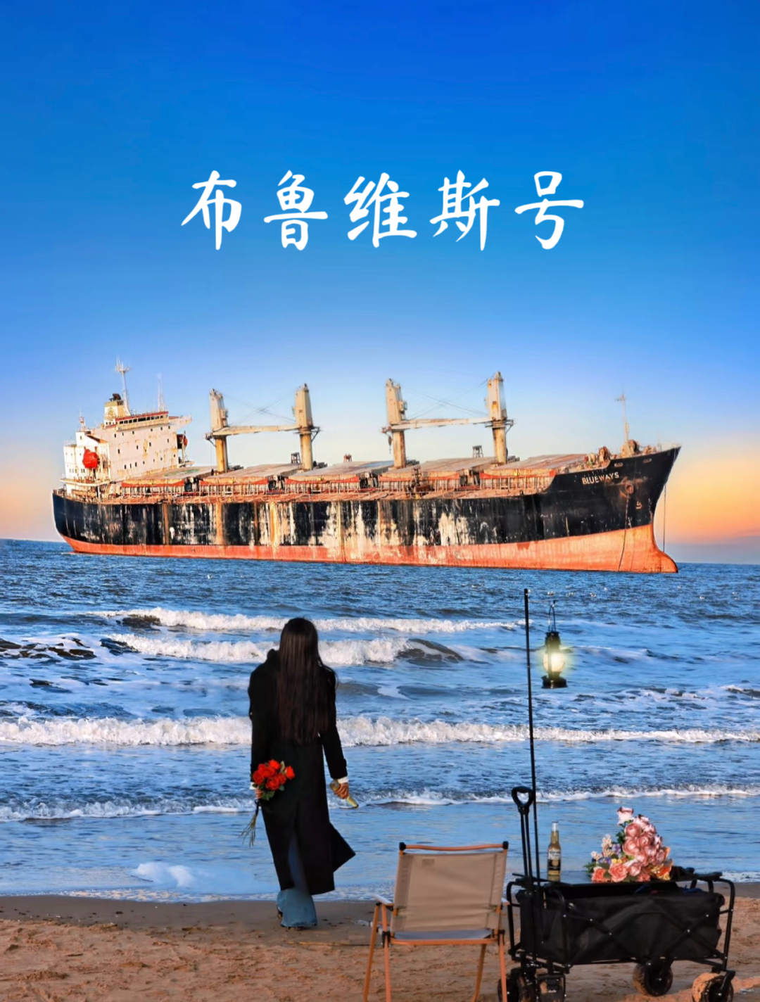 - 早起我们前往烟墩角天鹅湖,途经布鲁维斯号沉船打卡。它是一艘海边搁浅的来自巴拿马籍的货轮,2022年9月,受环流影响搁浅于山东威海那香海海域。