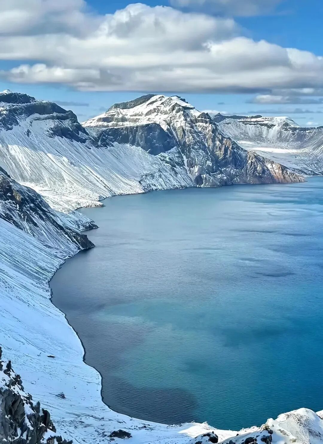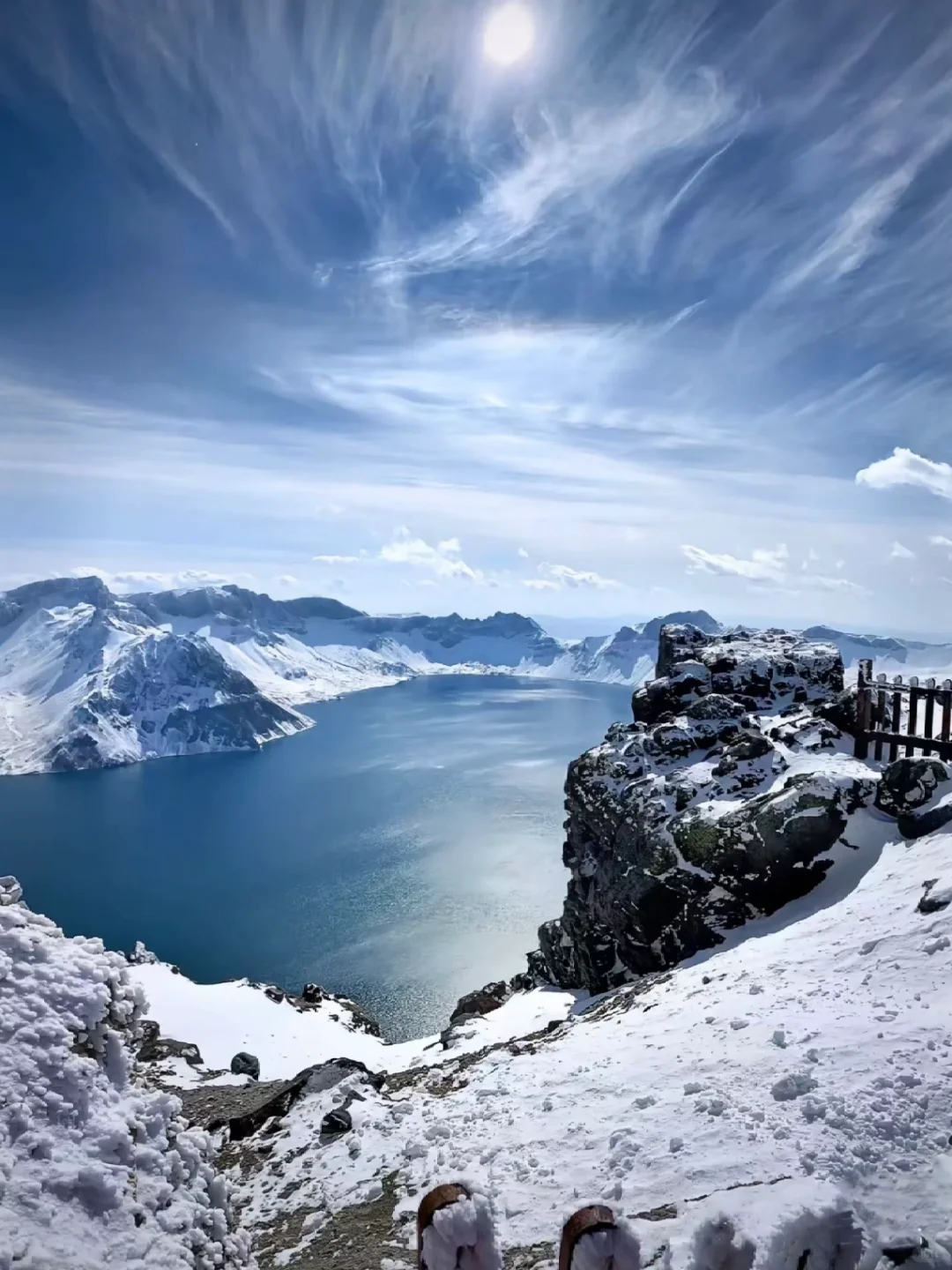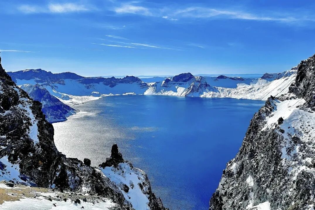 天池——冰雪童话世界:冬季的长白山被白雪覆盖。尤其是天池,湛蓝的湖水与纯白的雪岸形成鲜明对比,景色壮丽,丰富的玩雪体验:除了赏雪,还可以体验滑雪乐趣,或在天然雪地温泉中感受冰火两重天