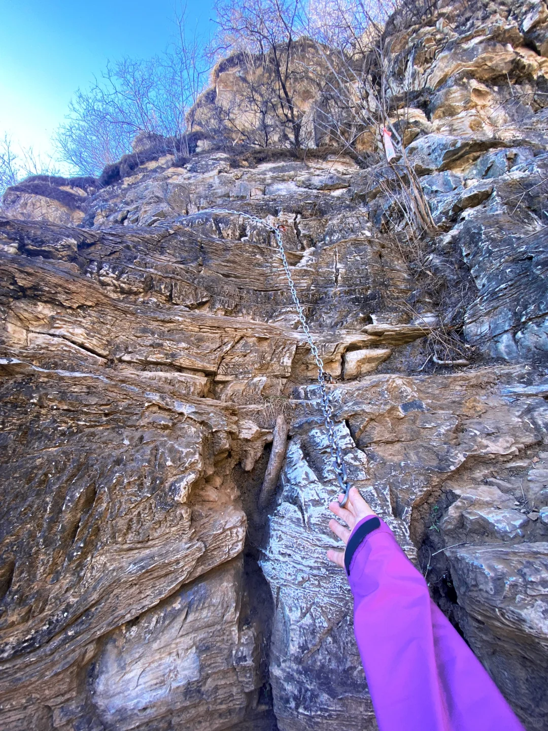 南北梯位于房山区韩村河镇圣水峪村,其山属太行余脉与燕山山脉交汇处,南梯巧妙借助峭壁上天然的石隙用石块铺筑成了一段石阶路,而北梯完全天然形成,有几段几乎是从悬崖峭壁上垂直穿过,如同天梯一般直通九霄。南北梯位于青银沟两侧近乎垂直的峭壁之间,原为当地人所称的“南笸箩”与“北笸箩”,是在悬崖上开凿出的登山小径。部分路段陡如竖梯,需垂直攀爬,因而被驴友形象地命名为“南北梯”。其惊险程度,与铁陀山、狗牙山、东灵山等经典路线齐名,成为众多户外爱好者挑战自我的向往之地。