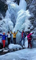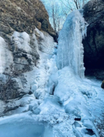山谷深处,一道高10米、宽5米的冰面飘于崖边,像壮美的瀑布一样,冰瀑右下边的冰面已经被“撕破”,露出后面的凹型空洞,宛若花果山上的水帘洞。洞口的冰瀑珠帘玉垂如在开半帘的厚重帏幕帘,让洞里充满神秘感。近距离接触冰瀑,由上而下的流水冻结了各种姿态的冰瀑,非常震撼,两边黝黑的岩石衬托着冰瀑更加洁白迷人。