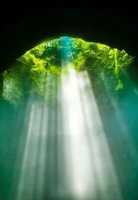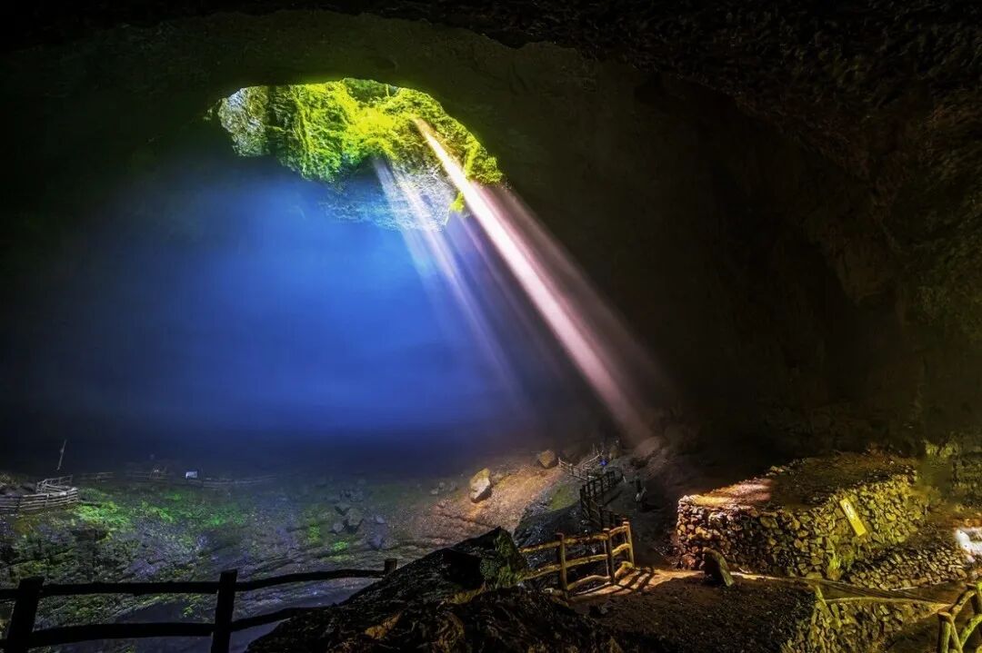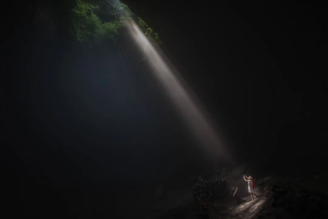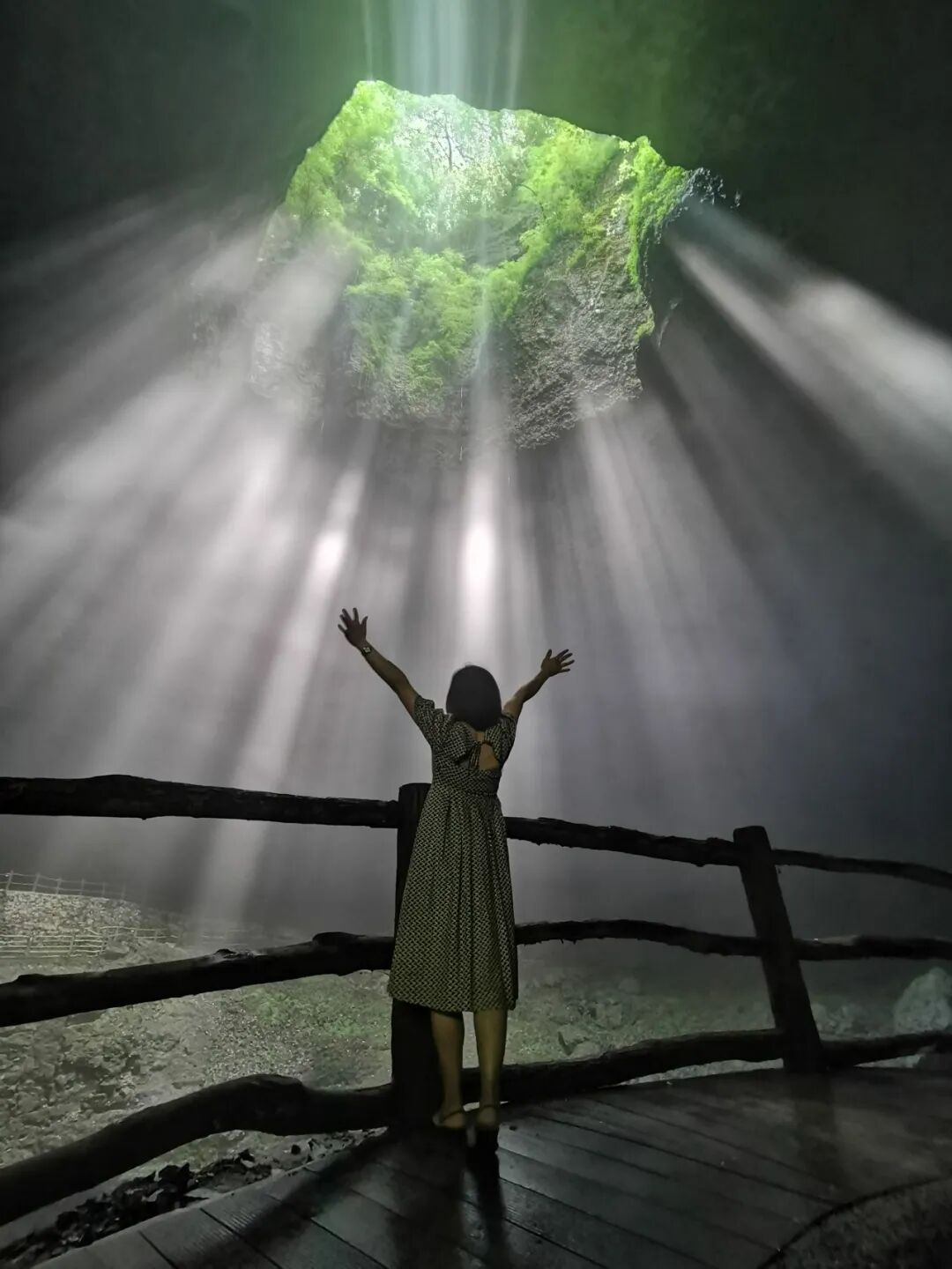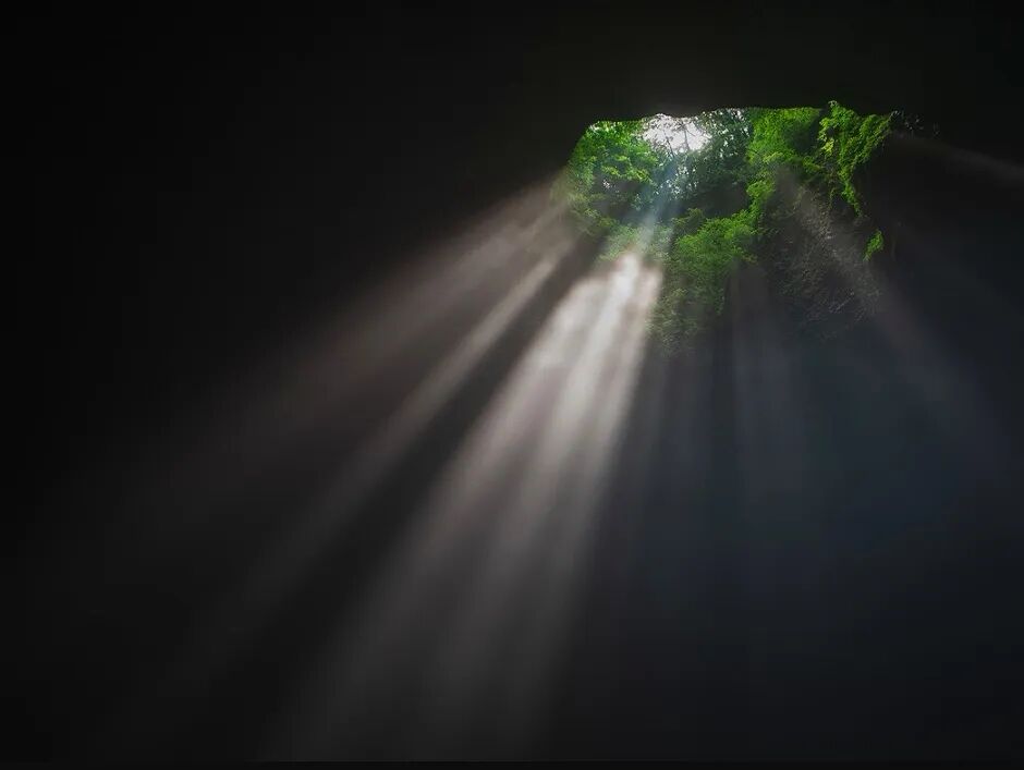 世世代代很少走出大山的当地人并不知道被他们视为风水宝地的那个地方竟然会是一处世界奇观,他们将天坑称之为“洞”,是因为在天坑的底部,有一个巨大的溶洞,洞口不大,进去之后却豁然开朗,可容纳数千人的洞底又是一个深约百米的天坑。洞内天窗上流水潺潺滴下,散为水雾,晴日抬头仰望,一束阳光从溶洞顶上天然形成的巨大圆形穿洞口上直射下来,形成百米光柱,透过光柱,蓝天白云清晰可见,水雾间彩虹缤纷,玉珠落盘,颇为壮观。