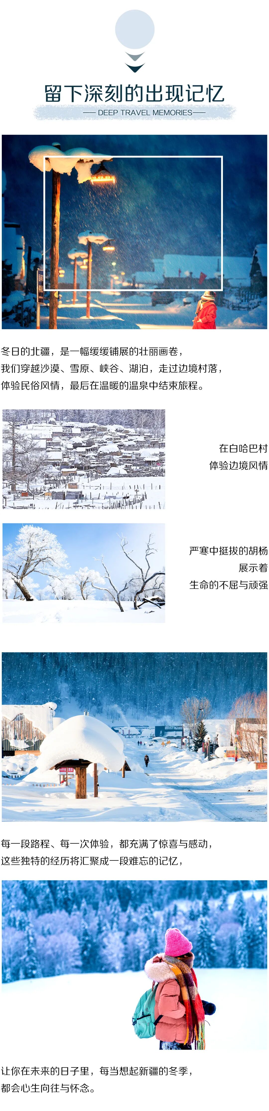3. 门票:景点大门票+区间车:禾木+白哈巴+喀纳斯门票套票(景区冬季只售卖套票,)、克拉美丽沙山公园、安集海大峡谷、乌尔禾胡杨林暂不收费,如遇政策性收费,门票需自理。