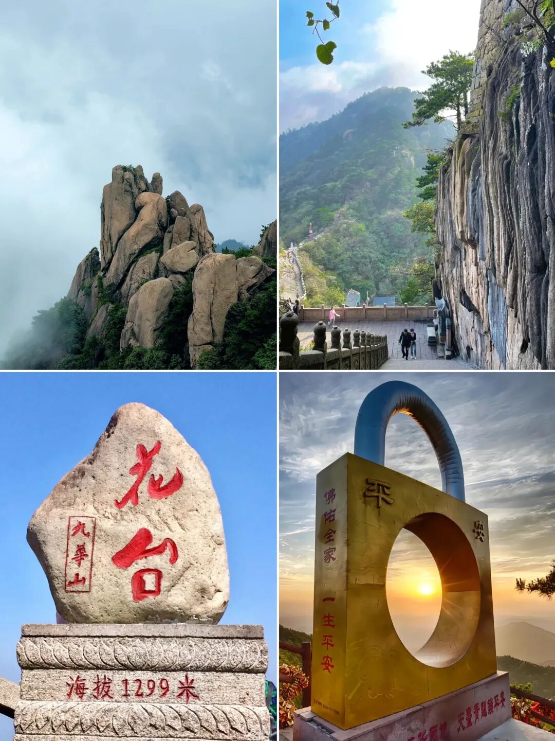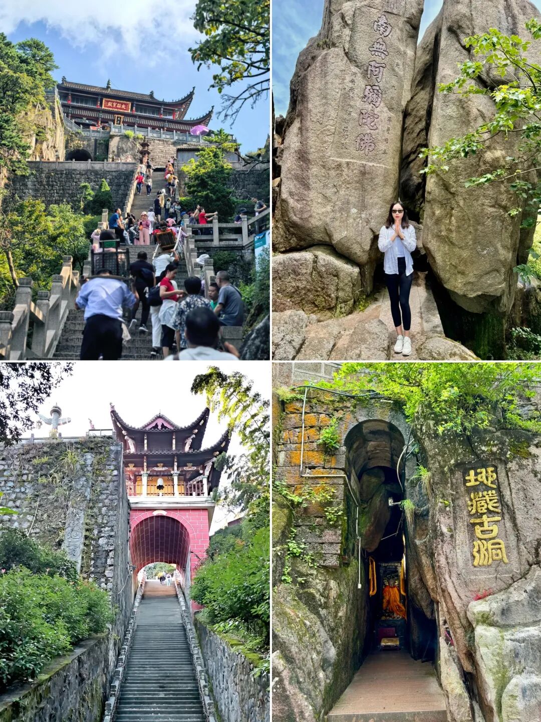 🔷九华山运动版:早上游客中心乘景交上山→迎仙桥检票口→九华街寺庙群《祇园寺(建筑精美,网红打卡)-法华寺(老财神殿)-化城寺(开山祖寺)-大厦庵(绍华禅师舍利子)-长生庵(祈福许愿)-无量寺(主供毗卢遮那佛)-旃(zhan)檀禅林(九华山最恢弘的寺庙)-上禅堂(历史悠久的滴水观音)-肉身宝殿(金地藏肉身)》→百岁宫→东崖禅寺→回香阁 (也可直接肉身宝殿做景交到凤凰松站 可省不少体力)→景交凤凰松站→天台(索道下站)→天台(索道上站) →古拜经台→一线天→罗汉墩禅寺→花台(索道上站) →花台(索道下站)→ 摆渡车→大愿文化园(99m地藏圣像) →5点停车场集合返程