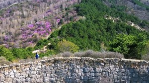 - 10:00|抵达徒步起点 整装跟随领队进山,每年四月底至五月中旬,是石窝长城的杜鹃花期。粉紫色的杜鹃花一丛丛、一簇簇地开放在山野间,它们不追求铺天盖地的阵势,而是恰到好处地点缀在巨石缝隙里、灌木丛间、长城墙根下。花瓣薄而透光,在阳光下呈现出温柔的粉紫色。漫山开遍杜鹃花,蜿蜒的长城像巨龙一样盘卧在山脊之上,红色的花丛点缀在山石之间,描绘了一幅充满北方豪情与浪漫的画卷。